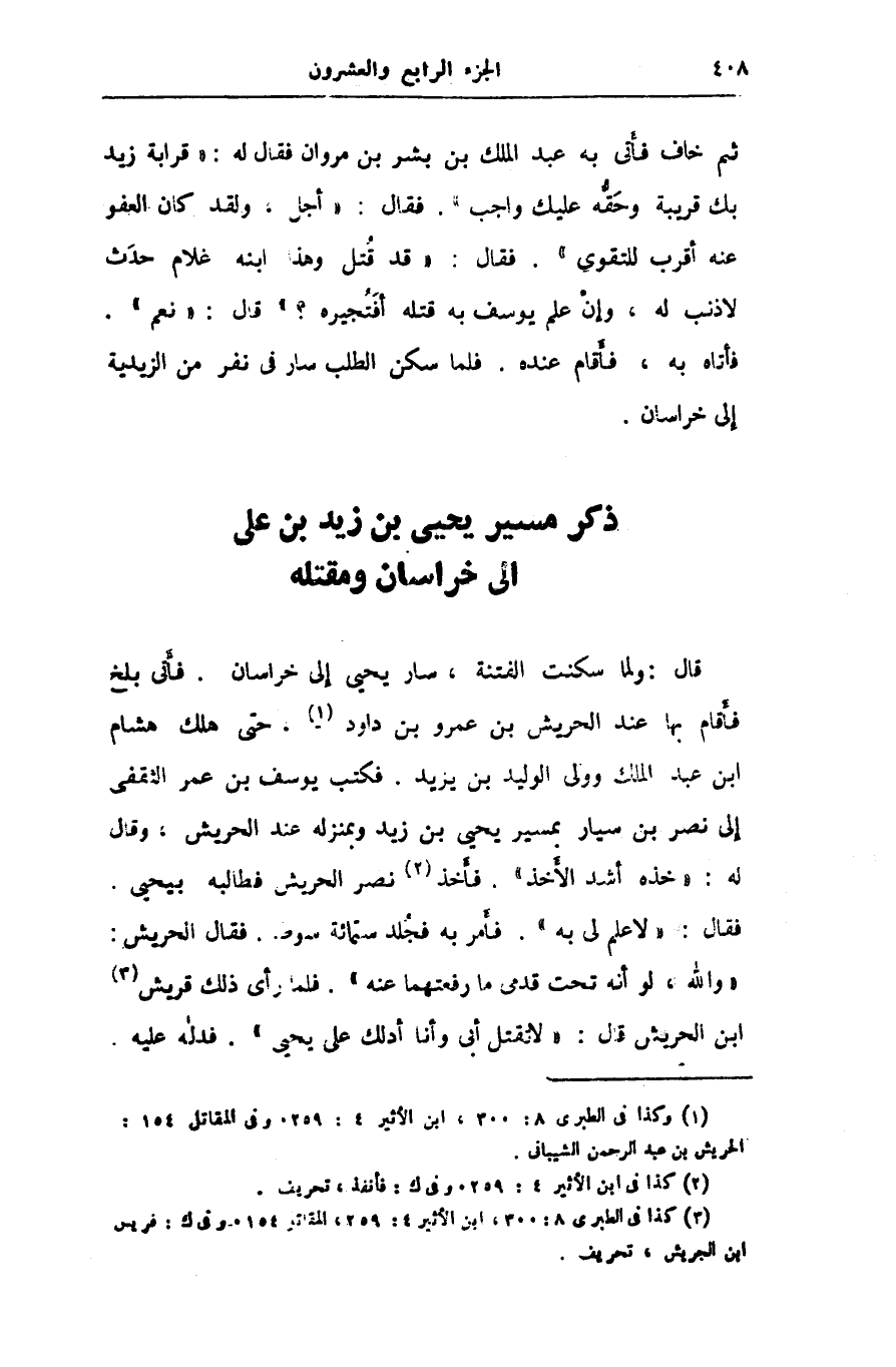 «والله، لو أنه تحت قدمى ما رفعتهما عنه» . فلما رأى ذلك قريش «3» ابن الحريش قال: «لا تقتل أبى وأنا أدلك على يحيى» . فدله عليه.