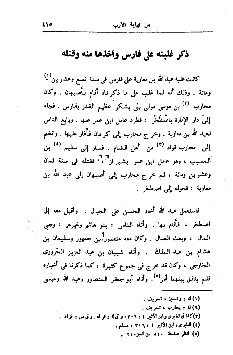 كانت غلبة عبد الله بن معاوية على فارس فى سنة تسع وعشرين «1» ومائة. وذلك أنه لما غلب على ما ذكرناه أقام بأصبهان. وكان محارب «2» بن موسى مولى بنى يشكر عظيم القدر بفارس. فجاء إلى دار الإمارة باصطخر، فطرد عامل ابن عمر عنها. وبايع الناس لعبد الله بن معاوية. وخرج محارب إلى كرمان فأغار عليها. وانضم إلى محارب قواد «3» من أهل الشام. فسار إلى سليم «4» بن المسبب، وهو عامل ابن عمر بشيراز، فقتله فى سنة ثمان وعشرين ومائة، ثم خرج محارب إلى أصبهان إلى عبد الله بن معاوية، فحوله إلى اصطخر.
