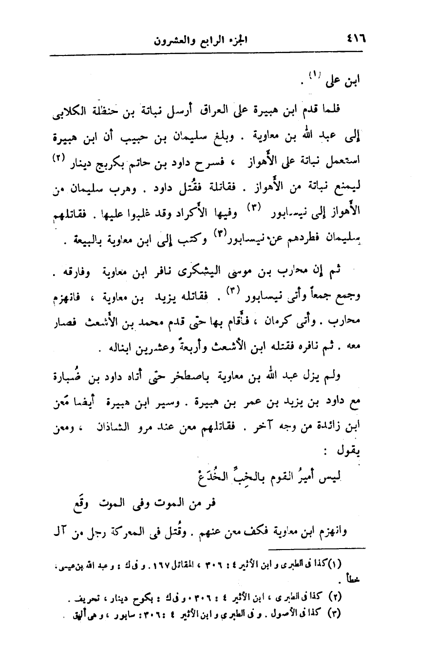فلما قدم ابن هبيرة على العراق أرسل نباتة بن حنظلة الكلابى إلى عبد الله بن معاوية. وبلغ سليمان بن حبيب أن ابن هبيرة استعمل نباتة على الأهواز، فسرح داود بن حاتم بكربج دينار «2» ليمنع نباتة من الأهواز. فقاتلة فقتل داود. وهرب سليمان من الأهواز إلى نيسابور «3» وفيها الأكراد وقد غلبوا عليها. فقاتلهم سليمان فطردهم عن نيسابور وكتب إلى ابن معاوية بالبيعة.