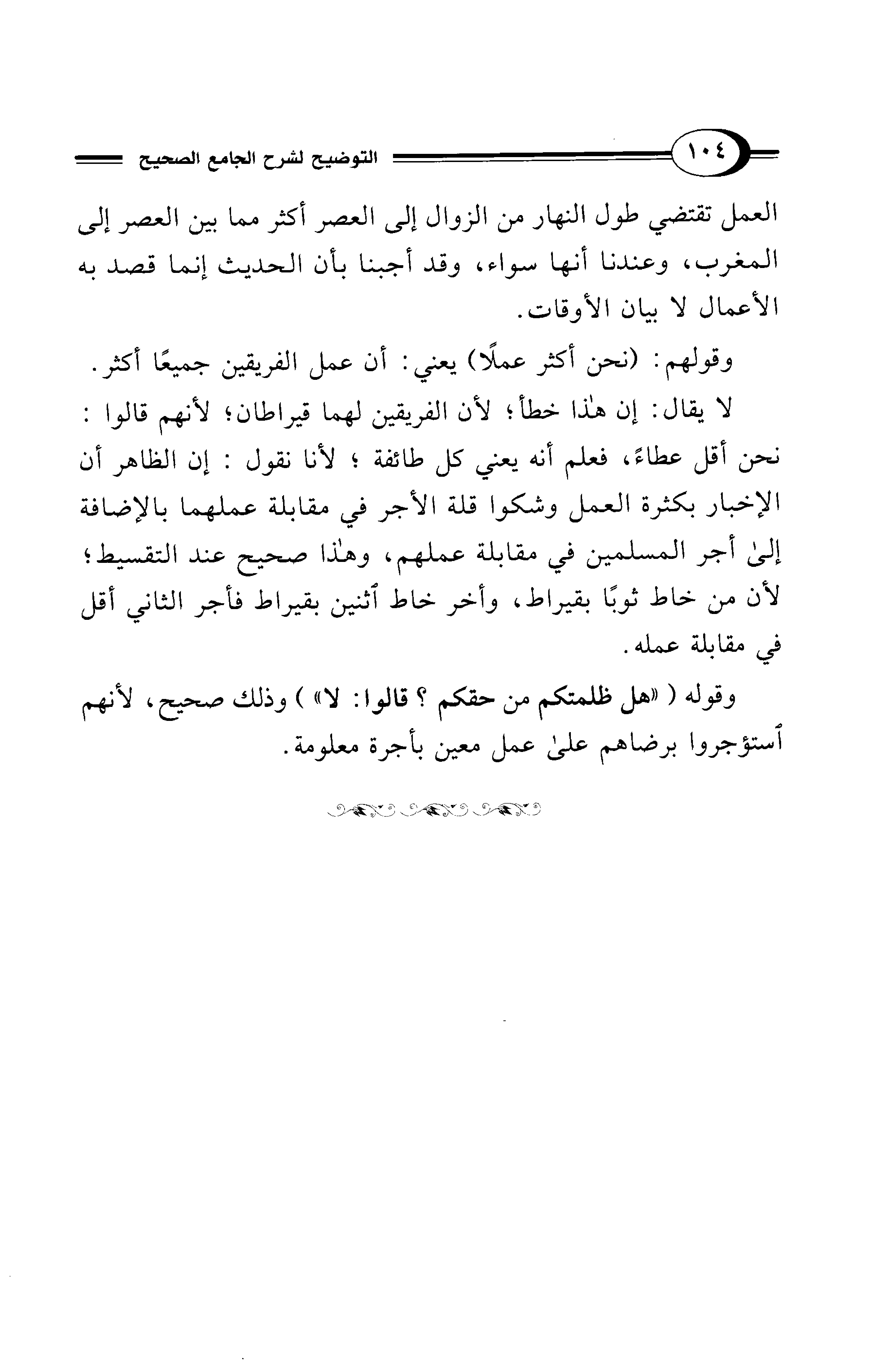وقوله ("هل ظلمتكم من حقكم؟ قالوا: لا") وذلك صحيح، لأنهم استؤجروا برضاهم على عمل معين بأجرة معلومة.