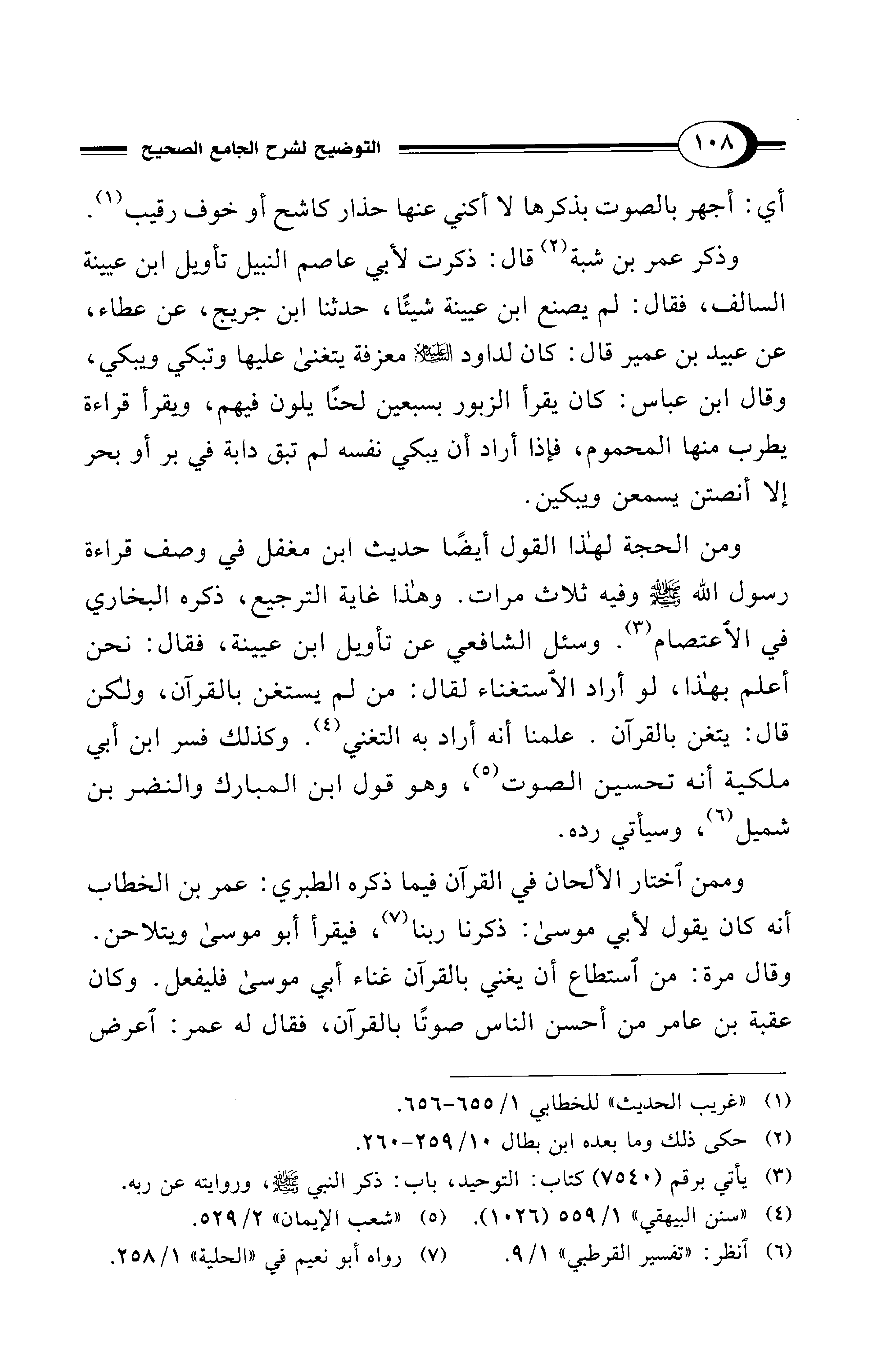 ومن الحجة لهذا القول أيضًا حديث ابن مغفل فى وصف قراءة رسول الله - صلى الله عليه وسلم - وفيه ثلاث مرات. وهذا غاية الترجيع، ذكره البخاري في الاعتصام (¬3). وسئل الشافعي عن تأويل ابن عيينة، فقال: نحن أعلم بهذا، لو أراد الاستغناء لقال: من لم يستغن بالقرآن، ولكن قال: يتغن بالقرآن. علمنا أنه أراد به التغني (¬4). وكذلك فسر ابن أبي ملكية أنه تحسين الصوت (¬5)، وهو قول ابن المبارك والنضر بن شميل (¬6)، وسيأتي رده.