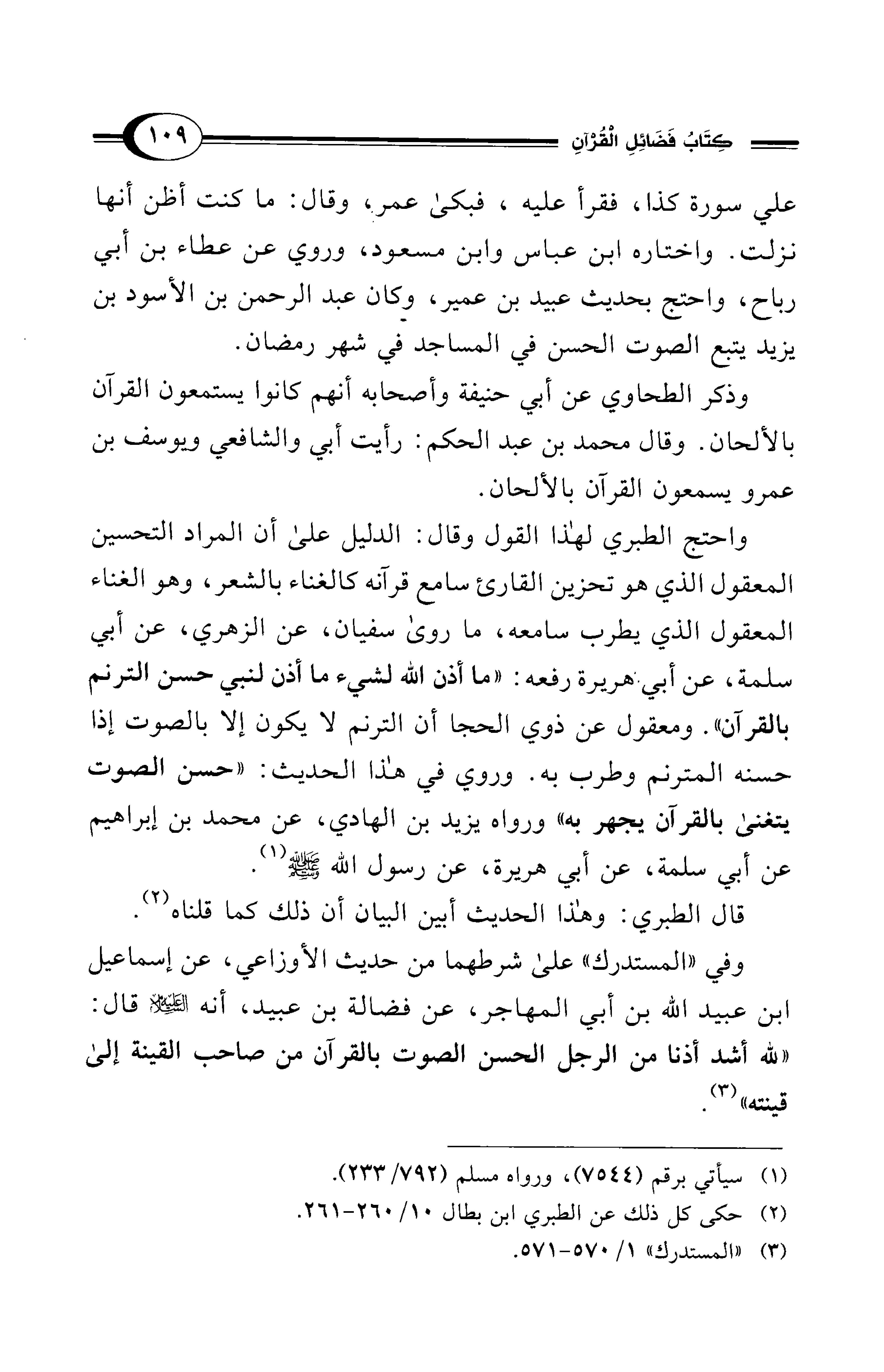 واحتج الطبري لهذا القول وقال: الدليل على أن المراد التحسين المعقول الذي هو تحزين القارئ سامع قرآنه كالغناء بالشعر، وهو الغناء المعقول الذي يطرب سامعه، ما روى سفيان، عن الزهري، عن أبي سلمة، عن أبي هريرة رفعه: "ما أذن الله لشيء ما أذن لنبي حسن الترنم بالقرآن". ومعقول عن ذوي الحجا أن الترنم لا يكون إلا بالصوت إذا حسنه المترنم وطرب به. وروي في هذا الحديث: "حسن الصوت يتغنى بالقرآن يجهر به" ورواه يزيد بن الهادي، عن محمد بن إبراهيم عن أبي سلمة، عن أبي هريرة، عن رسول الله - صلى الله عليه وسلم - (¬1).