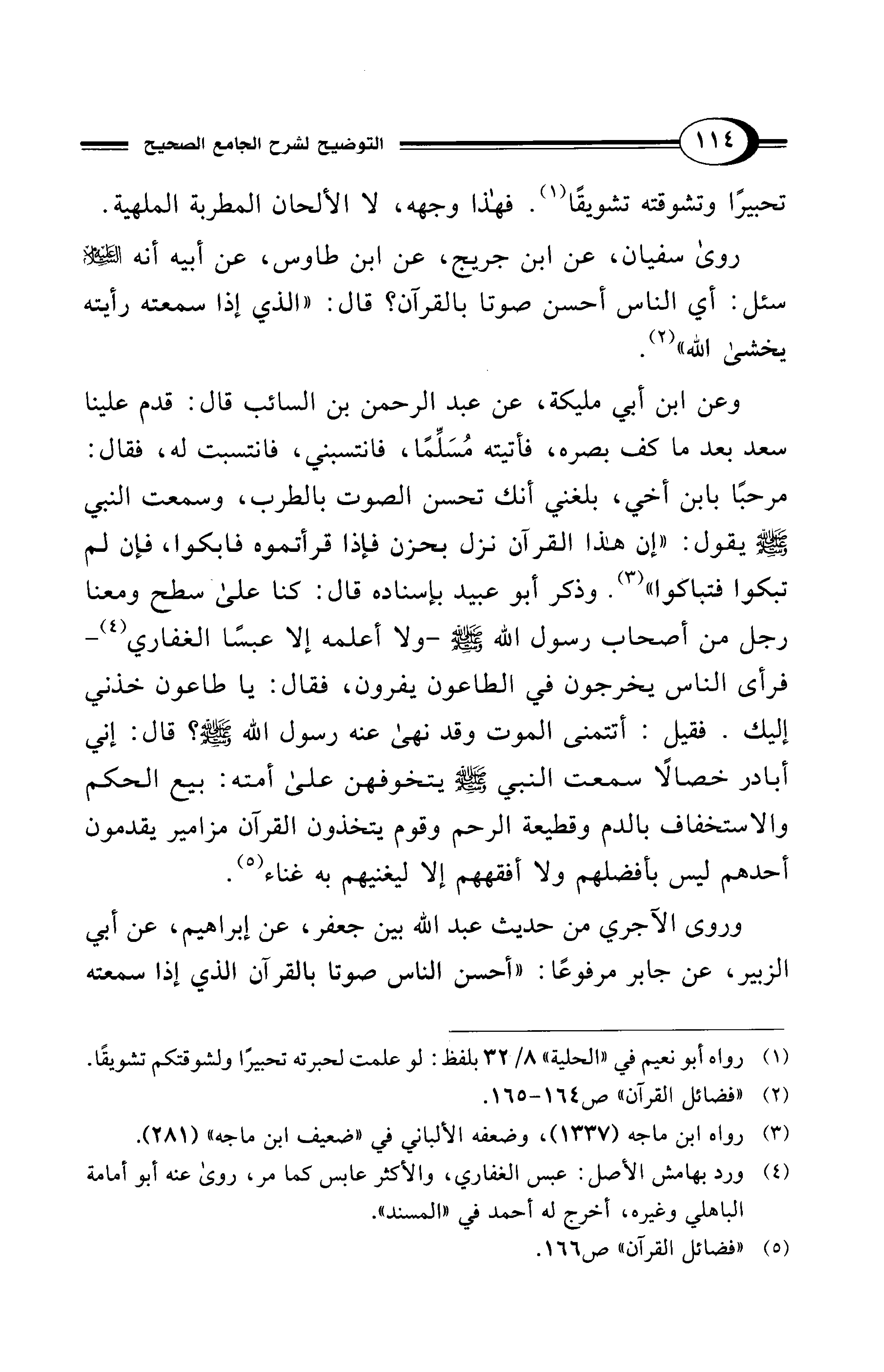 روى سفيان، عن ابن جريج، عن ابن طاوس، عن أبيه أنه - عليه السلام - سئل: أي الناس أحسن صوتا بالقرآن؟ قال: "الذي إذا سمعته رأيته يخشى الله" (¬2).