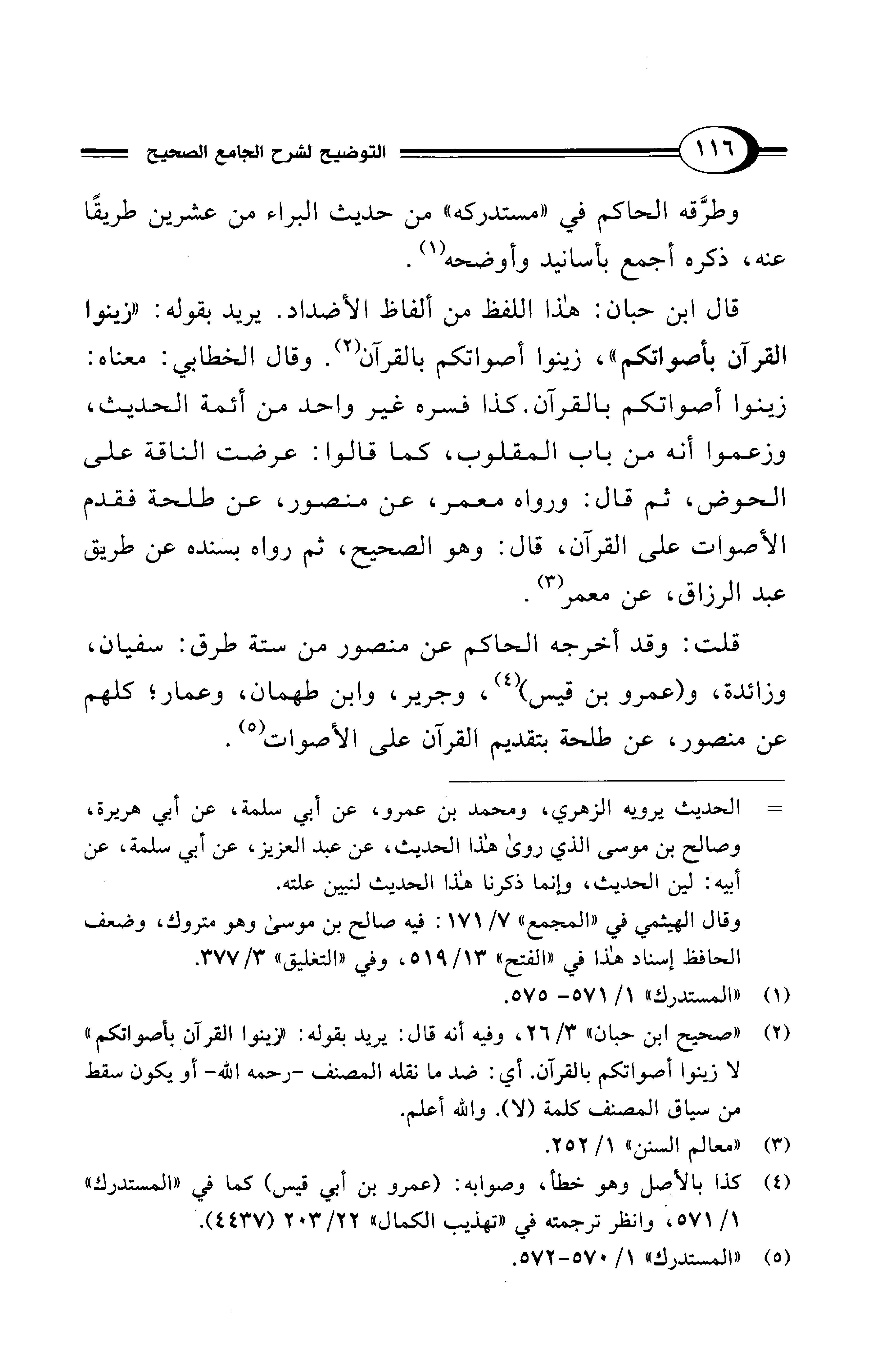 (¬2) "صحيح ابن حبان" 3/ 26، وفيه أنه قال: يريد بقوله: "زينوا القرآن بأصواتكم" لا زينوا أصواتكم بالقرآن. أي: ضد ما نقله المصنف -رحمه الله- أو يكون سقط من سياق المصنف كلمة (لا). والله أعلم.