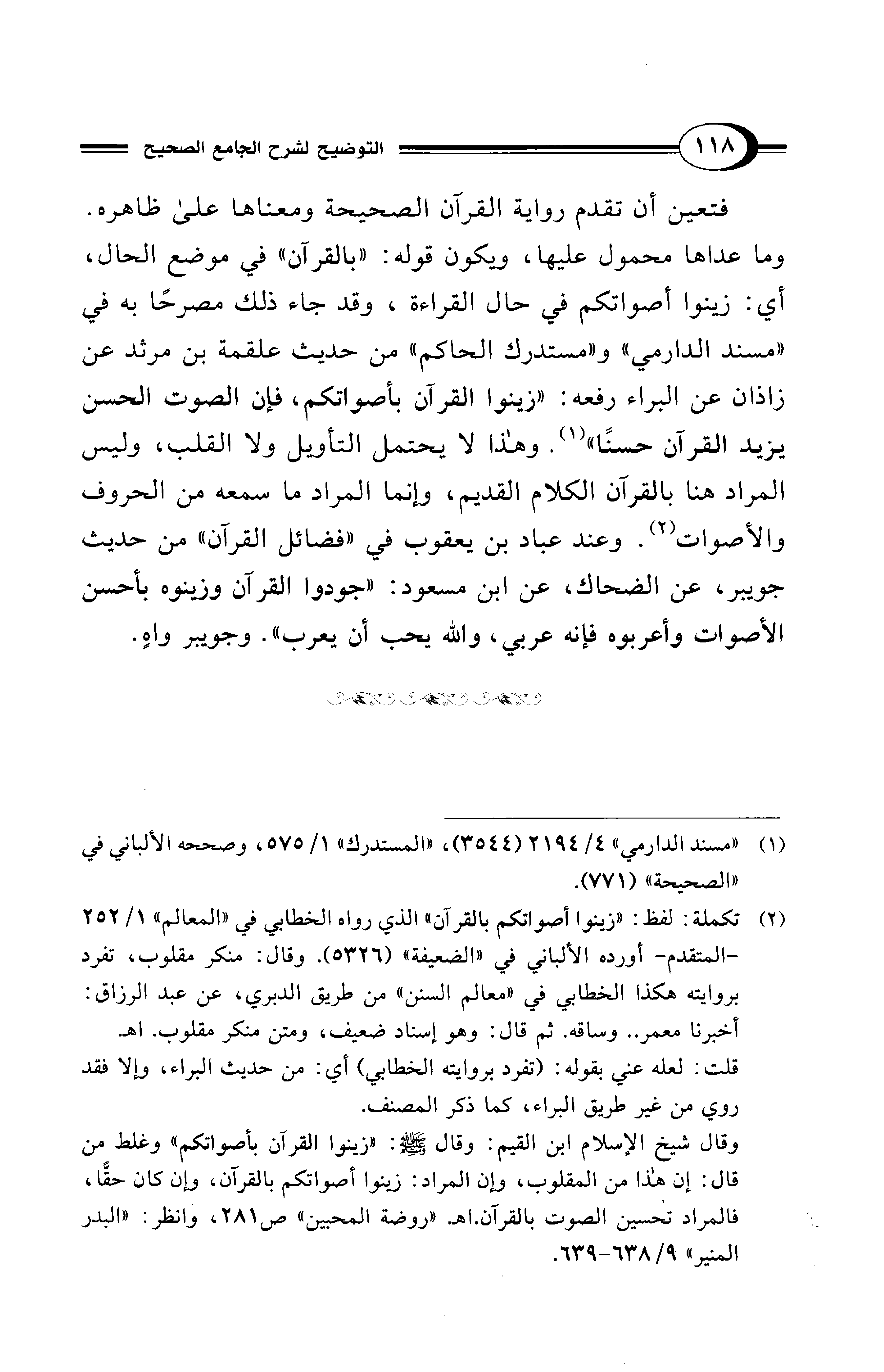 وقال شيخ الإسلام ابن القيم: وقال - صلى الله عليه وسلم -: "زينوا القرآن بأصواتكم" وغلط من قال: إن هذا من المقلوب، وإن المراد: زينوا أصواتكم بالقرآن، وإن كان حقًا، فالمراد تحسين الصوت بالقرآن. اهـ. "روضة المحبين" ص281، وانظر: "البدر المنير" 9/ 638 - 639.