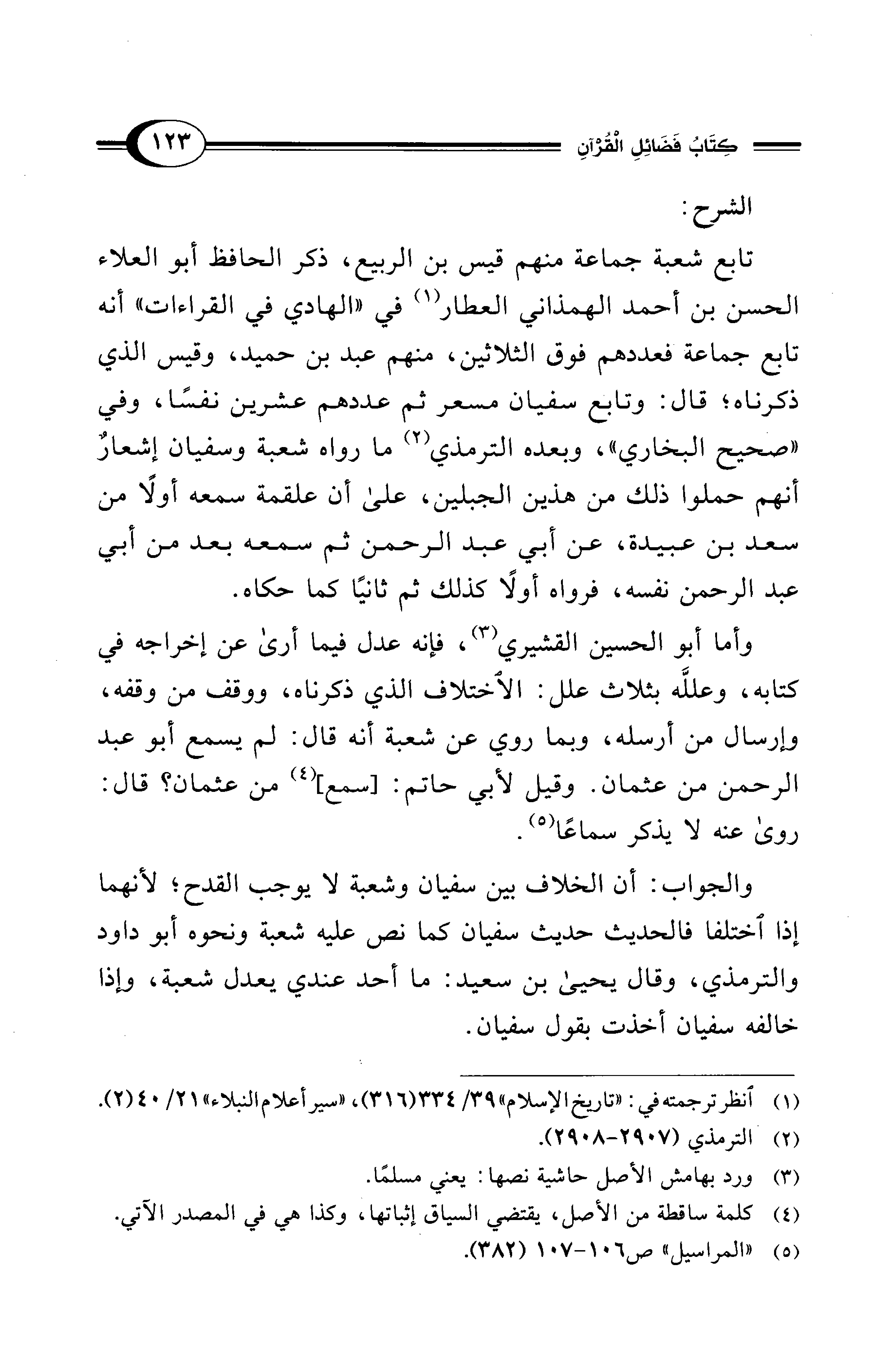 تابع شعبة جماعة منهم قيس بن الربيع، ذكر الحافظ أبو العلاء الحسن بن أحمد الهمذاني العطار (¬1) في "الهادي في القراءات" أنه تابع جماعة فعددهم فوق الثلاثين، منهم عبد بن حميد، وقيس الذي ذكرناه؛ قال: وتابع سفيان مسعر ثم عددهم عشرين نفسًا، وفي "صحيح البخاري"، وبعده الترمذي (¬2) ما رواه شعبة وسفيان إشعارٌ أنهم حملوا ذلك من هذين الجبلين، على أن علقمة سمعه أولًا من سعد بن عبيدة، عن أبي عبد الرحمن ثم سمعه بعد من أبي عبد الرحمن نفسه، فرواه أولًا كذلك ثم ثانيًا كما حكاه.