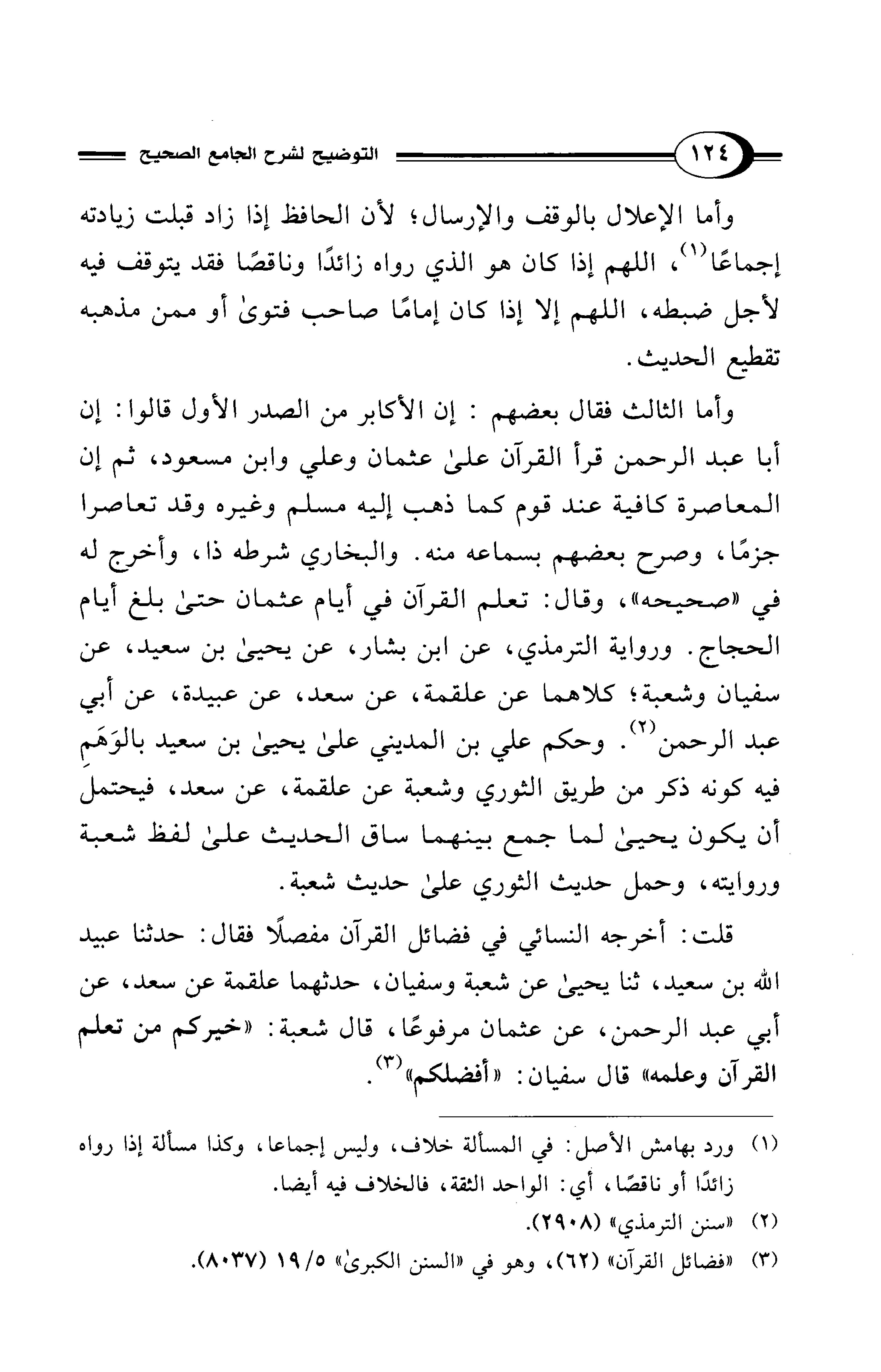 قلت: أخرجه النسائي في فضائل القرآن مفصلًا فقال: حدثنا عبيد الله بن سعيد، ثنا يحيى عن شعبة وسفيان، حدثهما علقمة عن سعد، عن أبي عبد الرحمن، عن عثمان مرفوعًا، قال شعبة: "خيركم من تعلم القرآن وعلمه" قال سفيان: "أفضلكم" (¬3).
