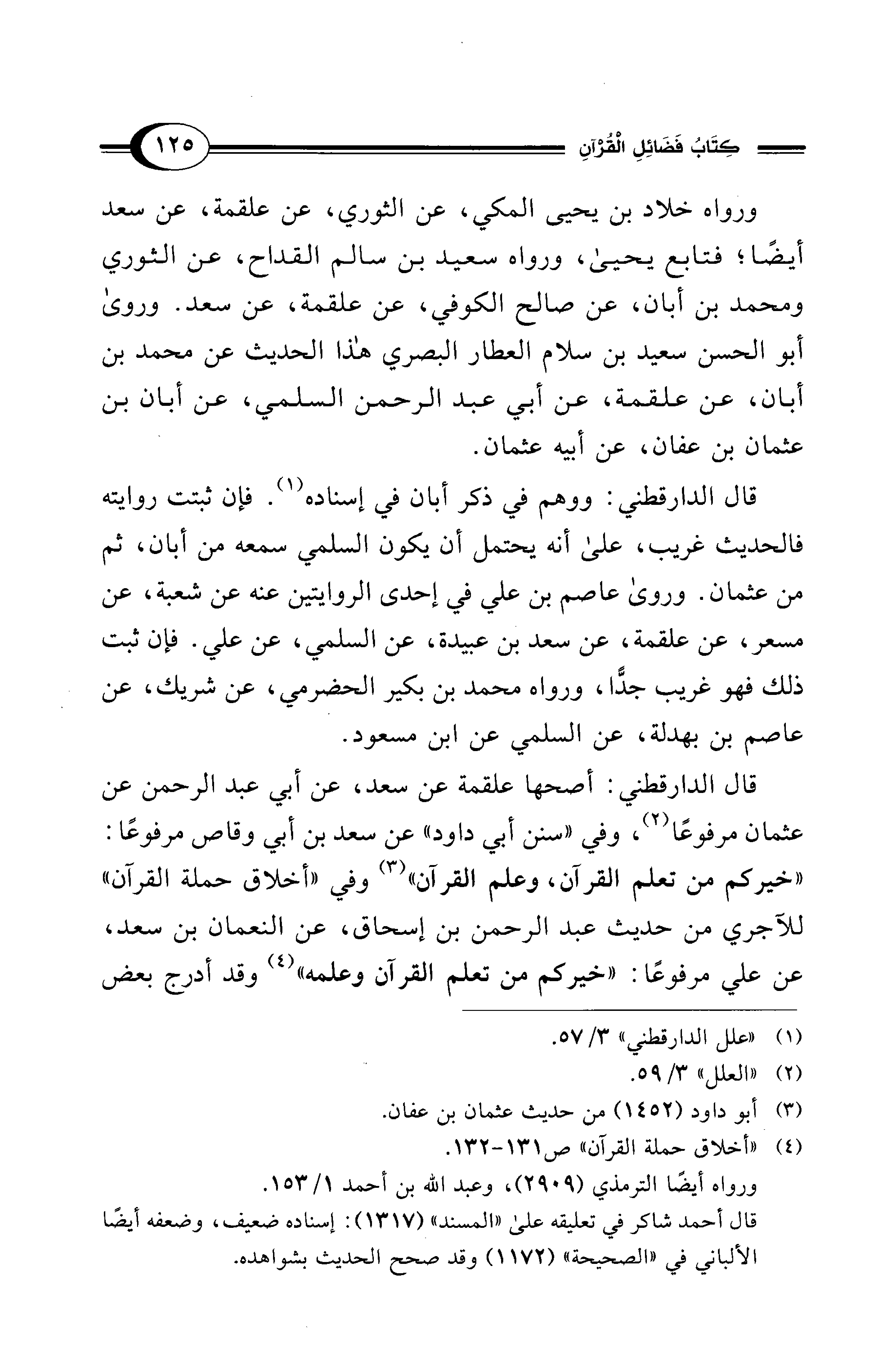 ورواه خلاد بن يحيى المكي، عن الثوري، عن علقمة، عن سعد أيضًا؛ فتابع يحيى، ورواه سعيد بن سالم القداح، عن الثوري ومحمد بن أبان، عن صالح الكوفي، عن علقمة، عن سعد. وروى أبو الحسن سعيد بن سلام العطار البصري هذا الحديث عن محمد بن أبان، عن علقمة، عن أبي عبد الرحمن السلمي، عن أبان بن عثمان بن عفان، عن أبيه عثمان.