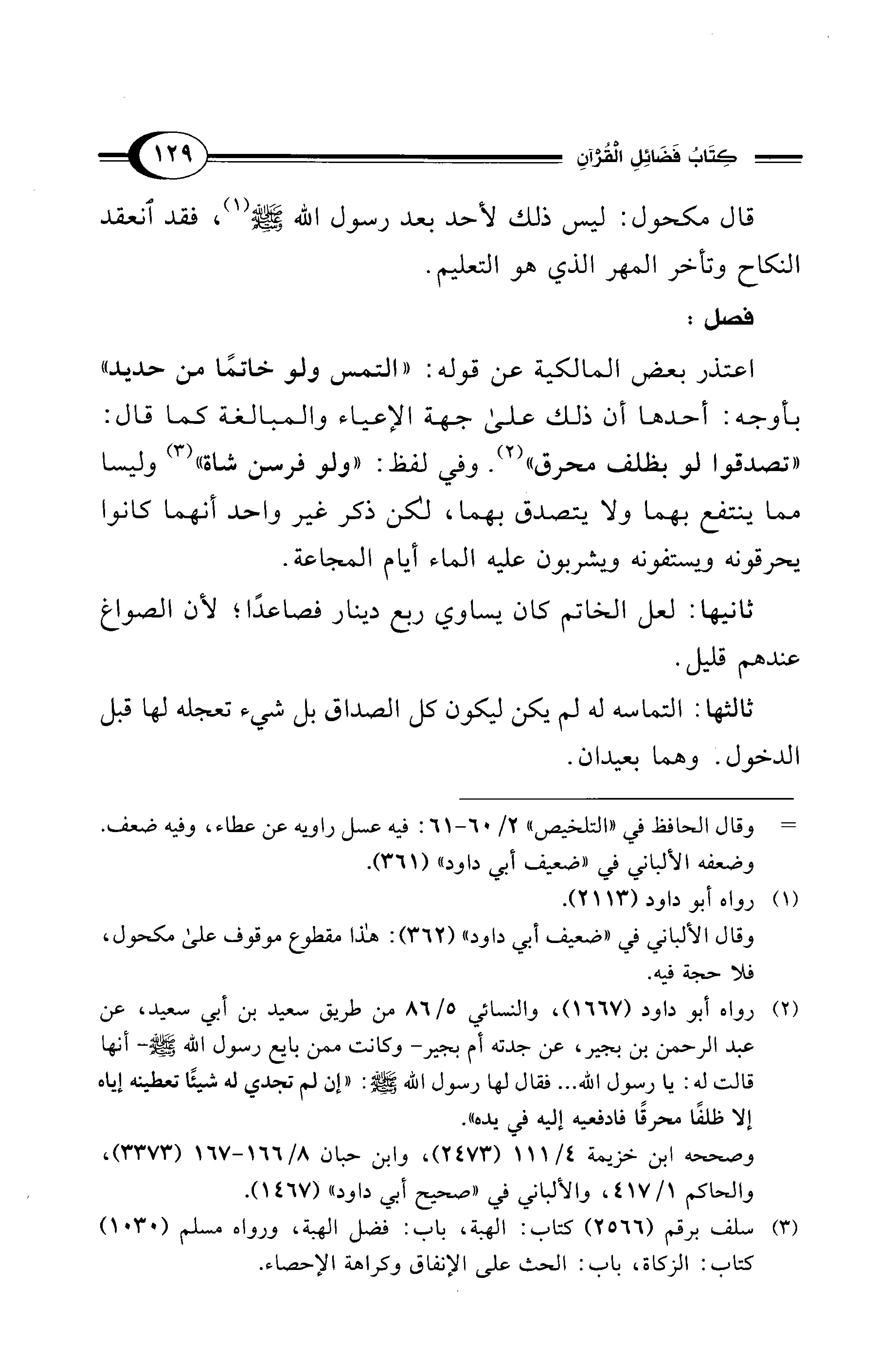 اعتذر بعض المالكية عن قوله: "التمس ولو خاتمًا من حديد" بأوجه: أحدها أن ذلك على جهة الإعياء والمبالغة كما قال: "تصدقوا لو بظلف محرق" (¬2). وفي لفظ: "ولو فرسن شاة" (¬3) وليسا مما ينتفع بهما ولا يتصدق بهما، لكن ذكر غير واحد أنهما كانوا يحرقونه ويستفونه ويشربون عليه الماء أيام المجاعة.