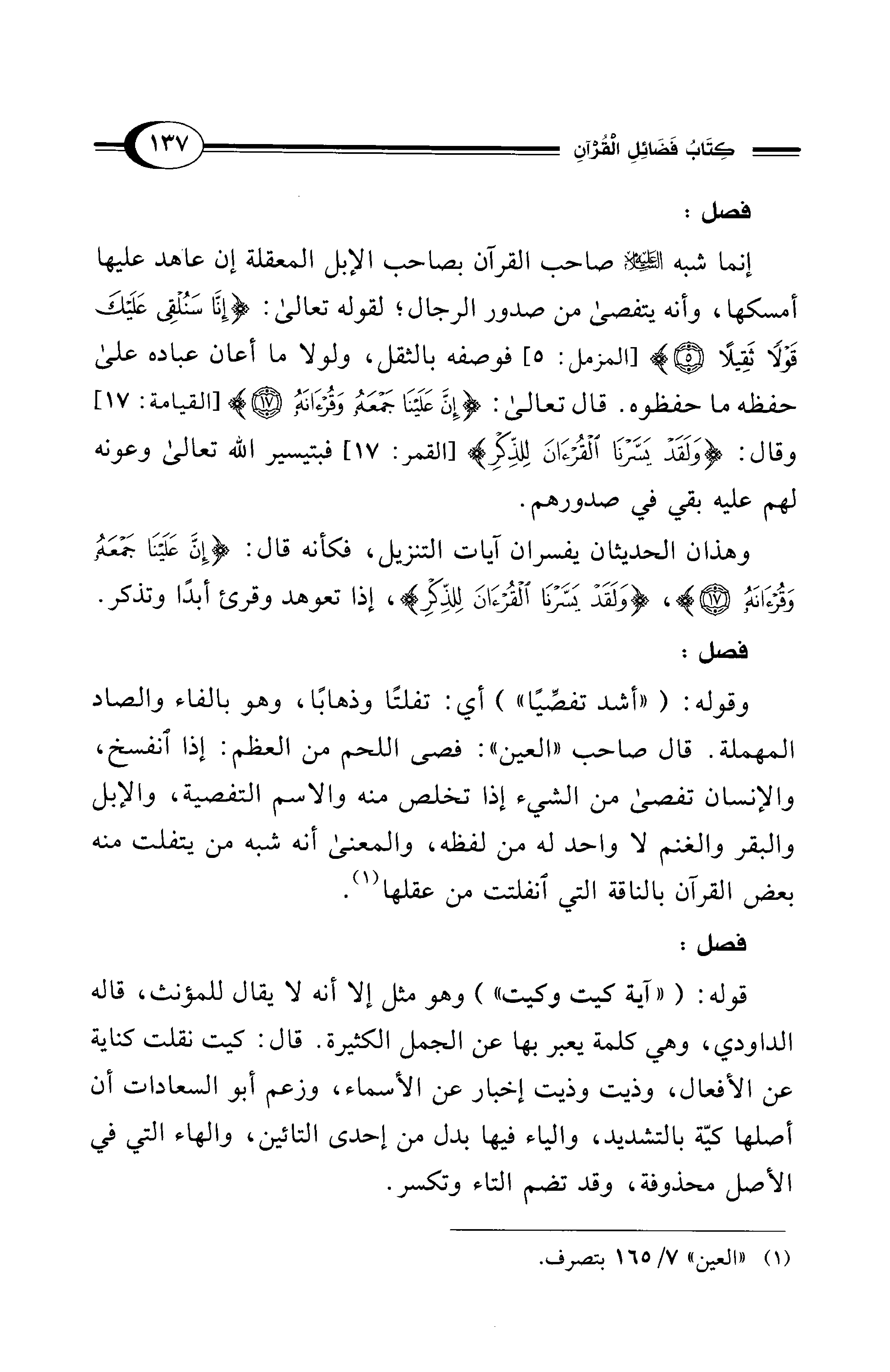 وقوله: ("أشد تفصِّيًا") أي: تفلتًا وذهابًا، وهو بالفاء والصاد المهملة. قال صاحب "العين": فصى اللحم من العظم: إذا انفسخ، والإنسان تفصى من الشيء إذا تخلص منه والاسم التفصية، والإبل والبقر والغنم لا واحد له من لفظه، والمعنى أنه شبه من يتفلت منه بعض القرآن بالناقة التي انفلتت من عقلها (¬1).