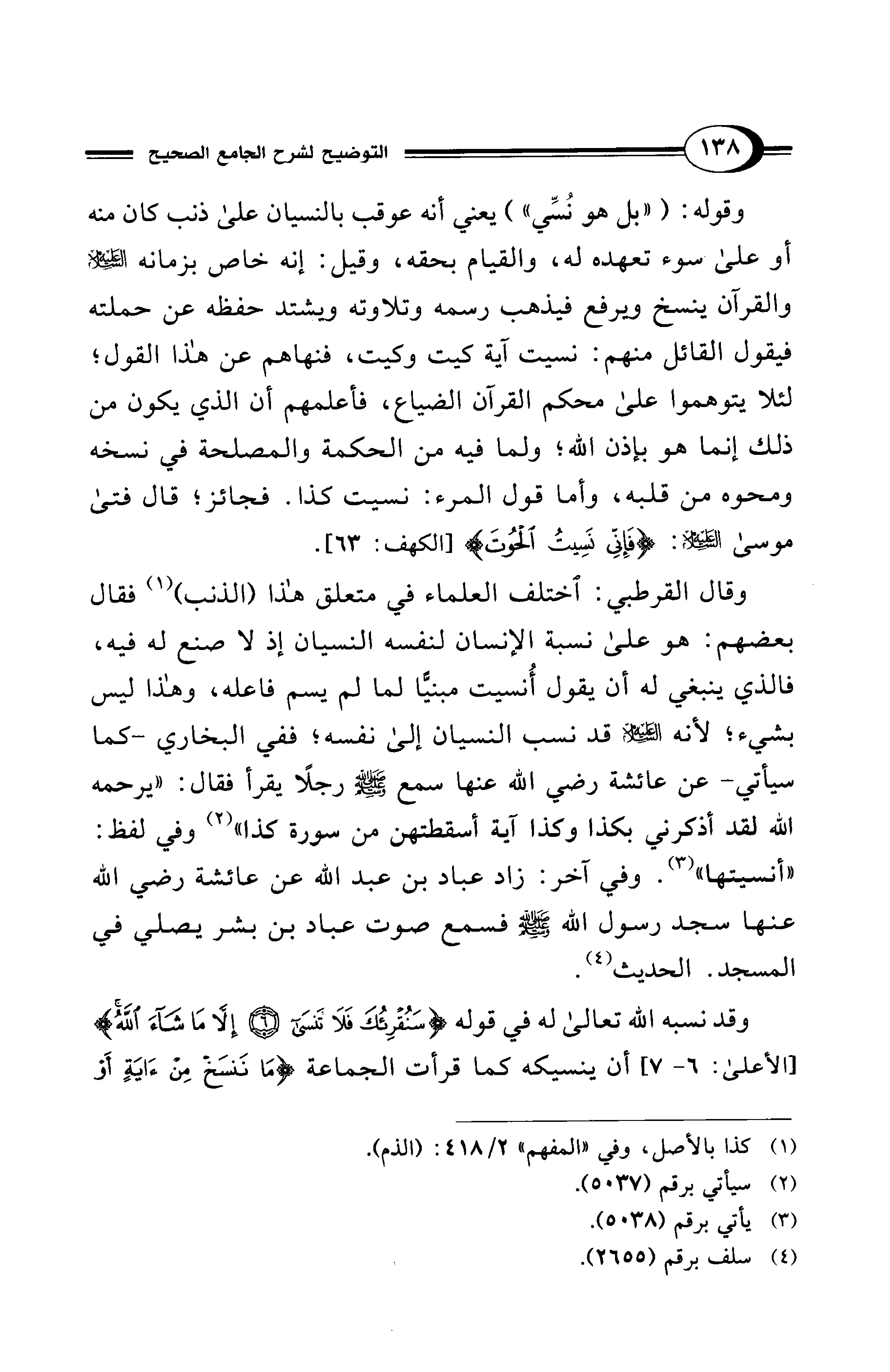 وقوله: ("بل هو نُسِّي") يعني أنه عوقب بالنسيان على ذنب كان منه أو على سوء تعهده له، والقيام بحقه، وقيل: إنه خاص بزمانه - عليه السلام - والقرآن ينسخ ويرفع فيذهب رسمه وتلاوته ويشتد حفظه عن حملته فيقول القائل منهم: نسيت آية كيت وكيت، فنهاهم عن هذا القول؛ لئلا يتوهموا على محكم القرآن الضياع، فأعلمهم أن الذي يكون من ذلك إنما هو بإذن الله؛ ولما فيه من الحكمة والمصلحة في نسخه ومحوه من قلبه، وأما قول المرء: نسيت كذا. فجائز؛ قال فتى موسى - عليه السلام -: {فَإِنِّي نَسِيتُ الْحُوتَ} [الكهف: 63].