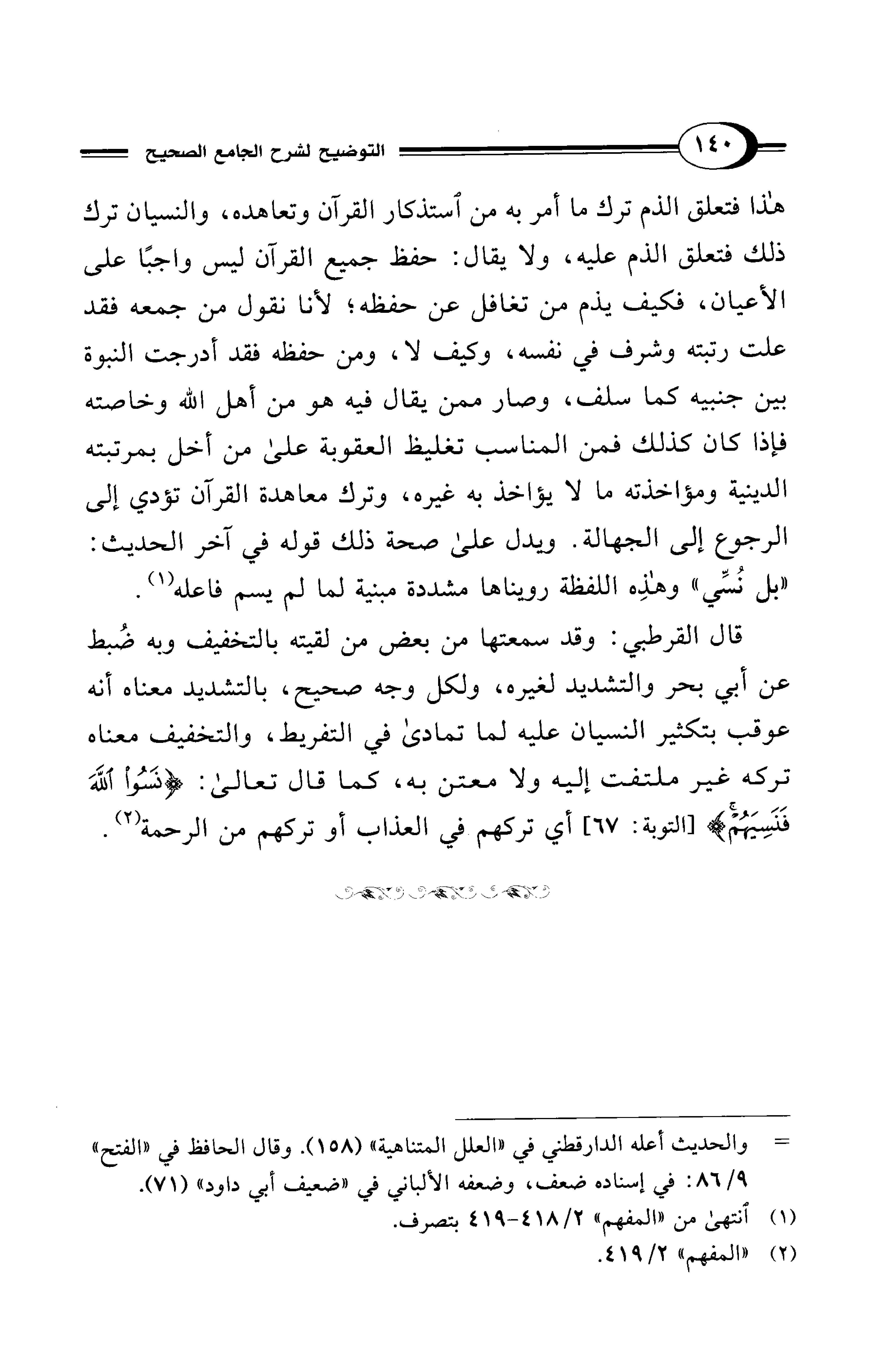 قال القرطبي: وقد سمعتها من بعض من لقيته بالتخفيف وبه ضُبط عن أبي بحر والتشديد لغيره، ولكل وجه صحيح، بالتشديد معناه أنه عوقب بتكثير النسيان عليه لما تمادى في التفريط، والتخفيف معناه تركه غير ملتفت إليه ولا معتن به، كما قال تعالى: {نَسُوا اللهَ فَنَسِيَهُمْ} [التوبة: 67] أي تركهم في العذاب أو تركهم من الرحمة (¬2).