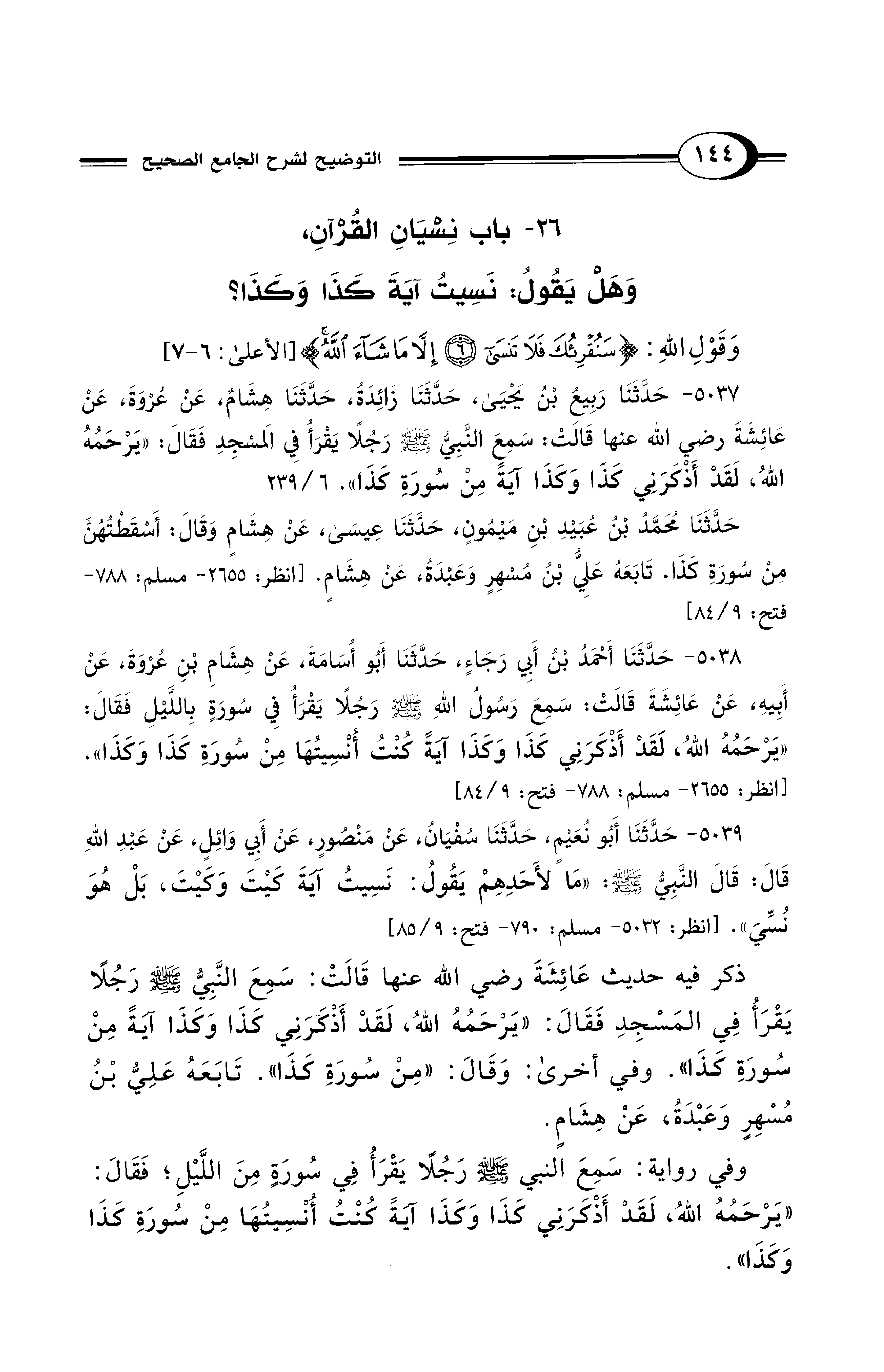 5038 - حَدَّثَنَا أَحْمَدُ بْنُ أَبِي رَجَاءٍ, حَدَّثَنَا أَبُو أُسَامَةَ, عَنْ هِشَامِ بْنِ عُرْوَةَ, عَنْ أَبِيهِ, عَنْ عَائِشَةَ قَالَتْ: سَمِعَ رَسُولُ اللهِ - صلى الله عليه وسلم - رَجُلاً يَقْرَأُ فِي سُورَةٍ بِاللَّيْلِ فَقَالَ: «يَرْحَمُهُ اللهُ لَقَدْ أَذْكَرَنِي كَذَا وَكَذَا آيَةً كُنْتُ أُنْسِيتُهَا مِنْ سُورَةِ كَذَا وَكَذَا». [انظر: 2655 - مسلم: 788 - فتح: 9/ 84]