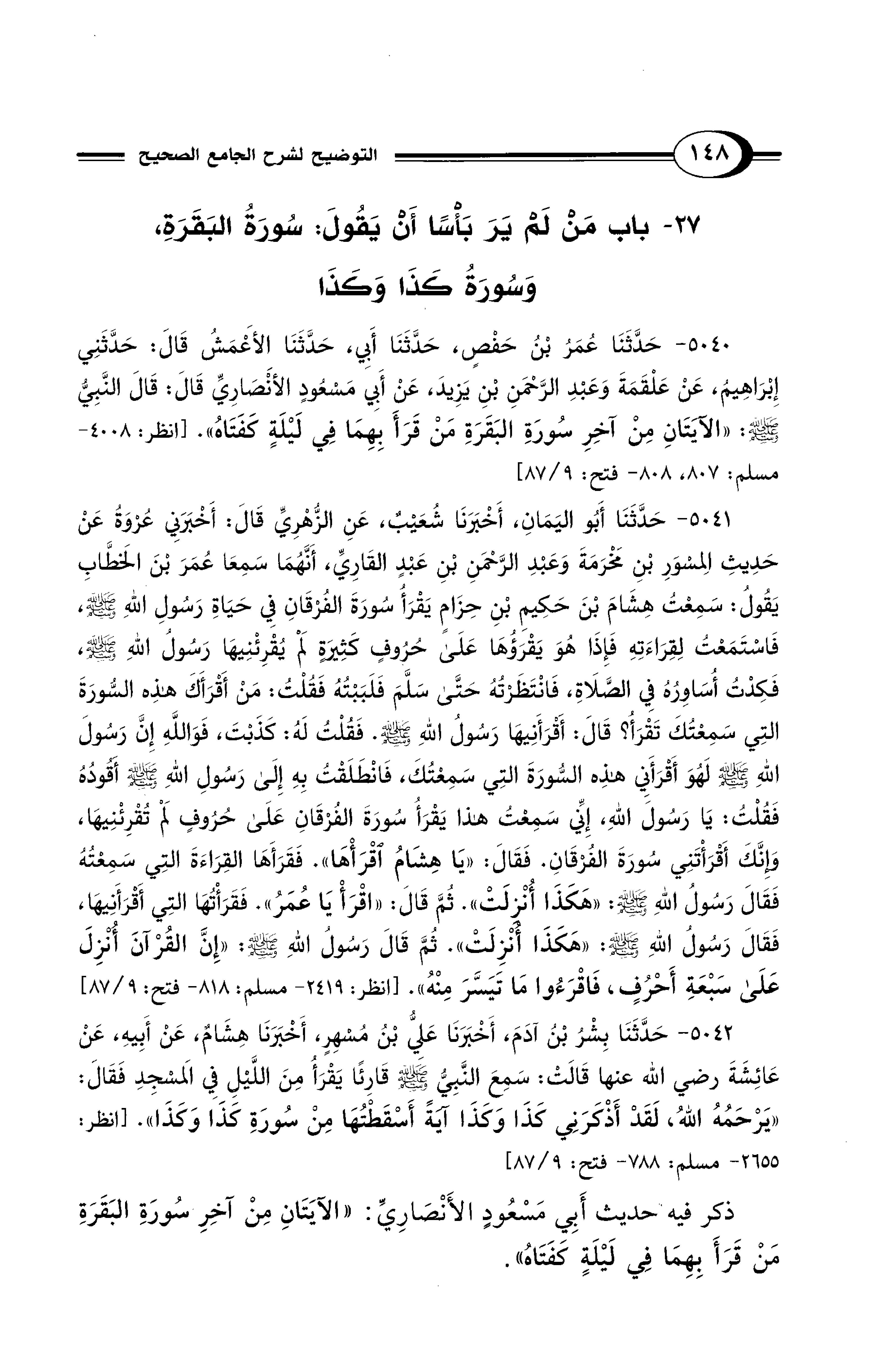 27 - باب مَنْ لَمْ يَرَ بَأسًا أَن يَقُولَ: سُورَةُ البَقَرَةِ، وَسُورَهُ كَذَا وَكَذَا