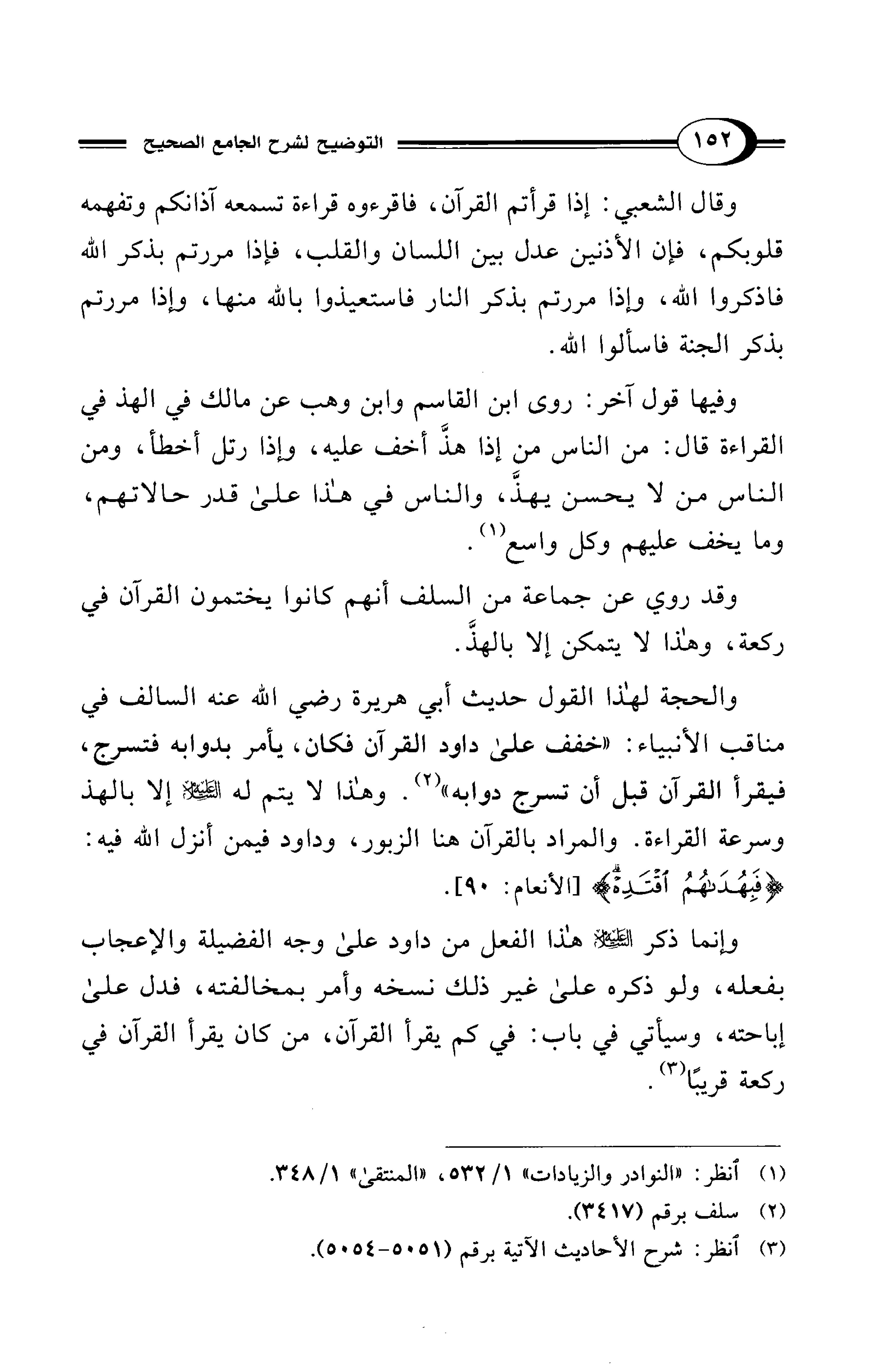 والحجة لهذا القول حديث أبي هريرة رضي الله عنه السالف في مناقب الأنبياء: "خفف على داود القرآن فكان، يأمر بدوابه فتسرج، فيقرأ القرآن قبل أن تسرج دوابه" (¬2). وهذا لا يتم له - عليه السلام - إلا بالهذ وسرعة القراءة. والمراد بالقرآن هنا الزبور، وداود فيمن أنزل الله فيه: {فَبِهُدَاهُمُ اقْتَدِهْ} [الأنعام: 90].