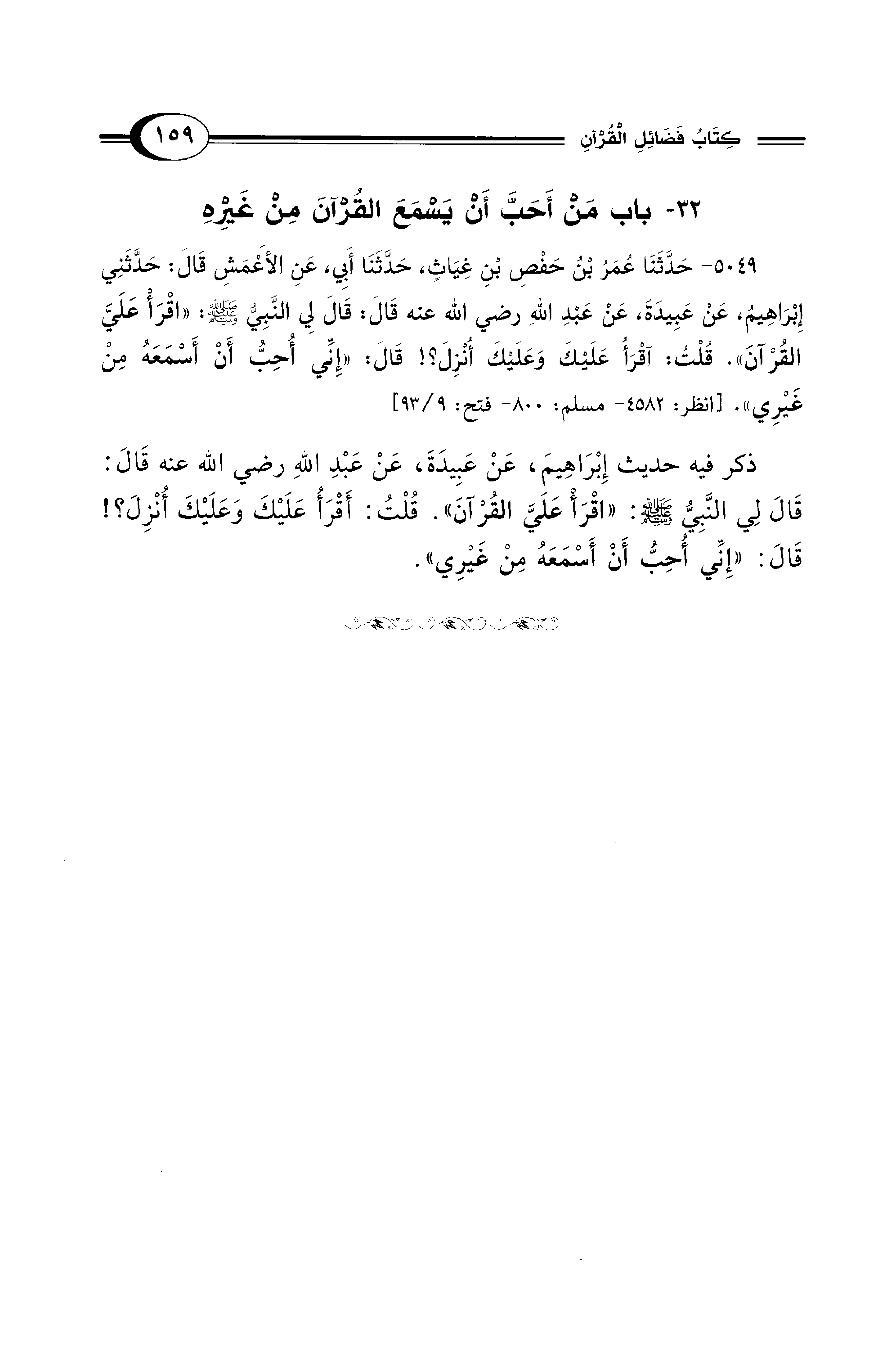 5049 - حَدَّثَنَا عُمَرُ بْنُ حَفْصِ بْنِ غِيَاثٍ , حَدَّثَنَا أَبِي, عَنِ الأَعْمَشِ قَالَ: حَدَّثَنِي إِبْرَاهِيمُ, عَنْ عَبِيدَةَ, عَنْ عَبْدِ اللهِ - رضي الله عنه - قَالَ: قَالَ لِي النَّبِيُّ - صلى الله عليه وسلم -: «اقْرَأْ عَلَيَّ الْقُرْآنَ». قُلْتُ: اقْرَأُ عَلَيْكَ وَعَلَيْكَ أُنْزِلَ؟! قَالَ: «إِنِّي أُحِبُّ أَنْ أَسْمَعَهُ مِنْ غَيْرِي». [انظر: 4582 - مسلم: 800 - فتح: 9/ 93]