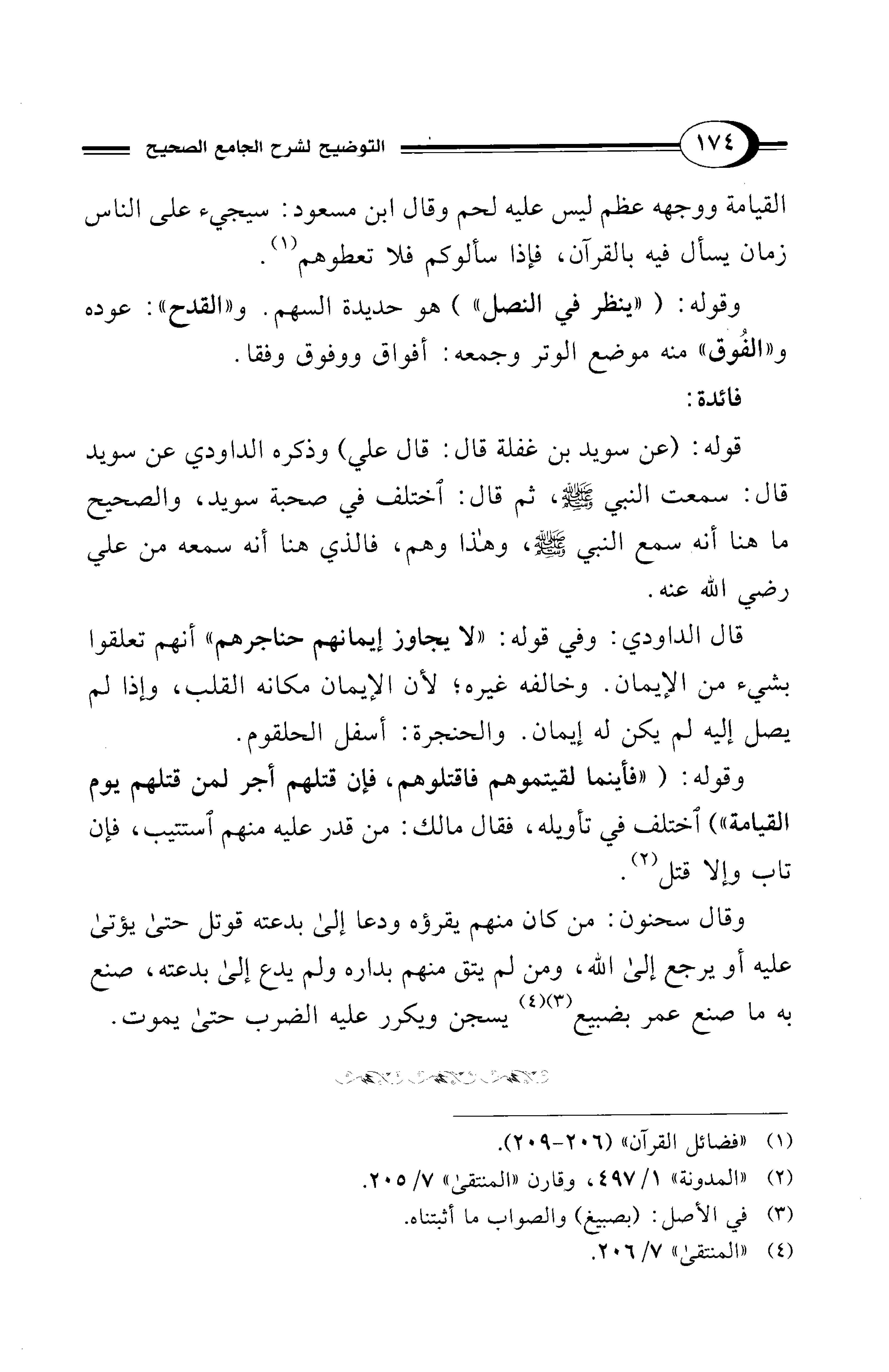 وقوله: ("ينظر في النصل") هو حديدة السهم. و"القدح": عوده و"الفُوق" منه موضع الوتر وجمعه: أفواق ووفوق وفقا.