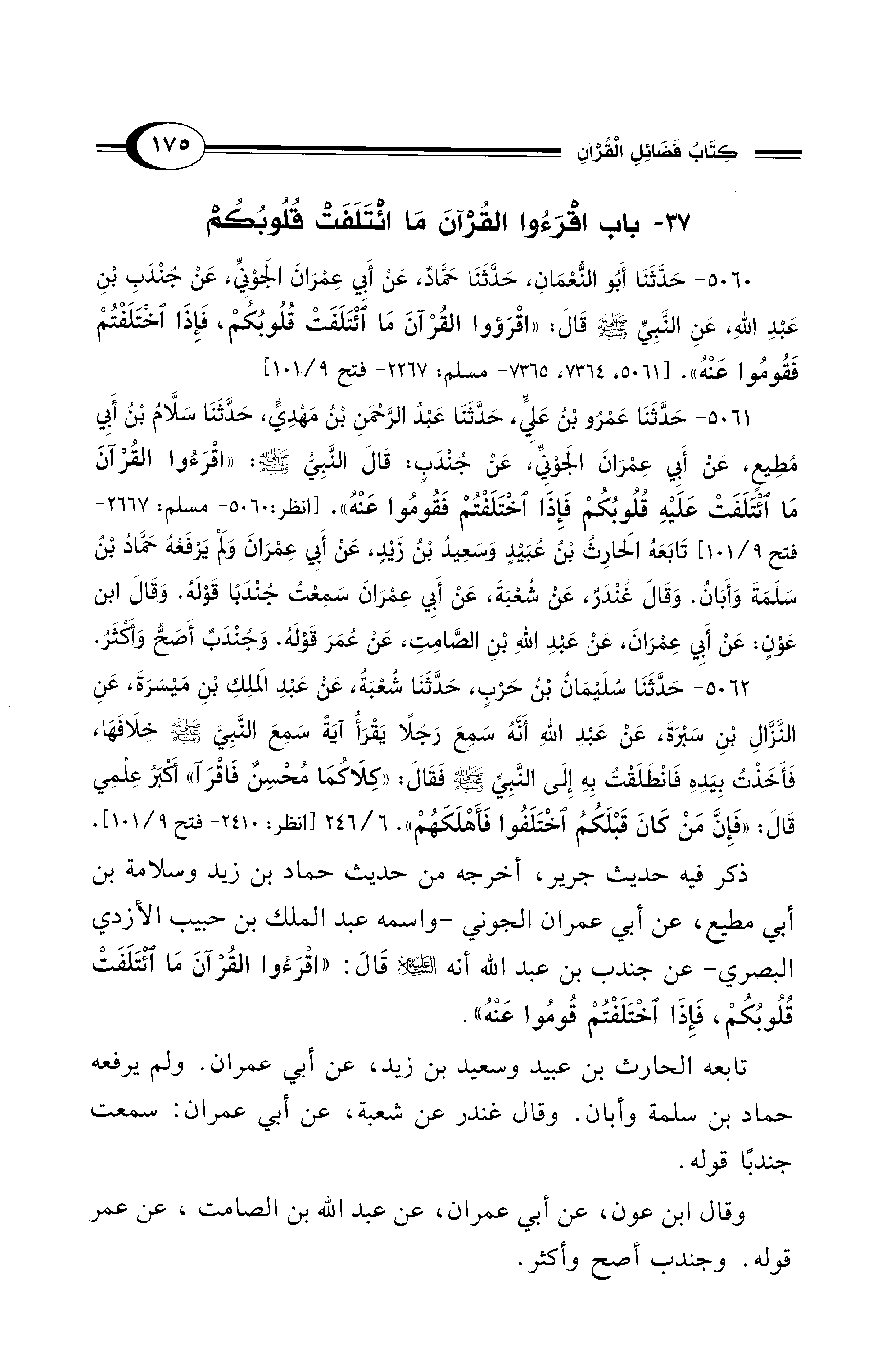 5060 - حَدَّثَنَا أَبُو النُّعْمَانِ, حَدَّثَنَا حَمَّادٌ, عَنْ أَبِي عِمْرَانَ الْجَوْنِيِّ, عَنْ جُنْدَبِ بْنِ عَبْدِ اللهِ, عَنِ النَّبِيِّ - صلى الله عليه وسلم - قَالَ: «اقْرَءُوا الْقُرْآنَ مَا ائْتَلَفَتْ قُلُوبُكُمْ، فَإِذَا اخْتَلَفْتُمْ فَقُومُوا عَنْهُ". [5061، 7364، 7365 - مسلم: 2267 - فتح 9/ 101]