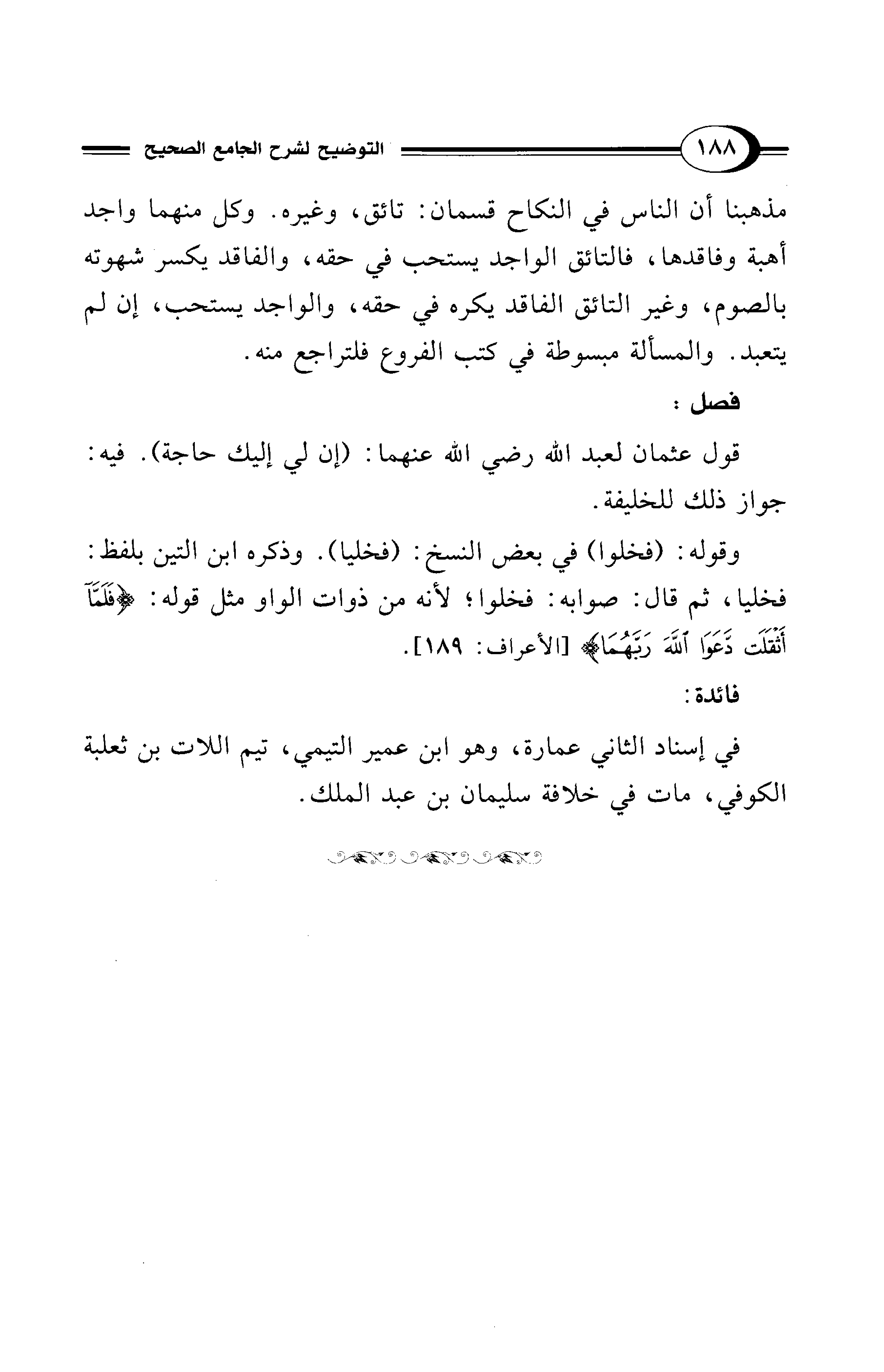 قول عثمان لعبد الله رضي الله عنهما: (إن لي إليك حاجة). فيه: جواز ذلك للخليفة. وقوله: (فخلوا) في بعض النسخ: (فخليا). وذكره ابن التين بلفظ: فخليا، ثم قال: صوابه: فخلوا؛ لأنه من ذوات الواو مثل قوله: {فَلَمَّا أَثْقَلَتْ دَعَوَا اللهَ رَبَّهُمَا} [الأعراف: 189].