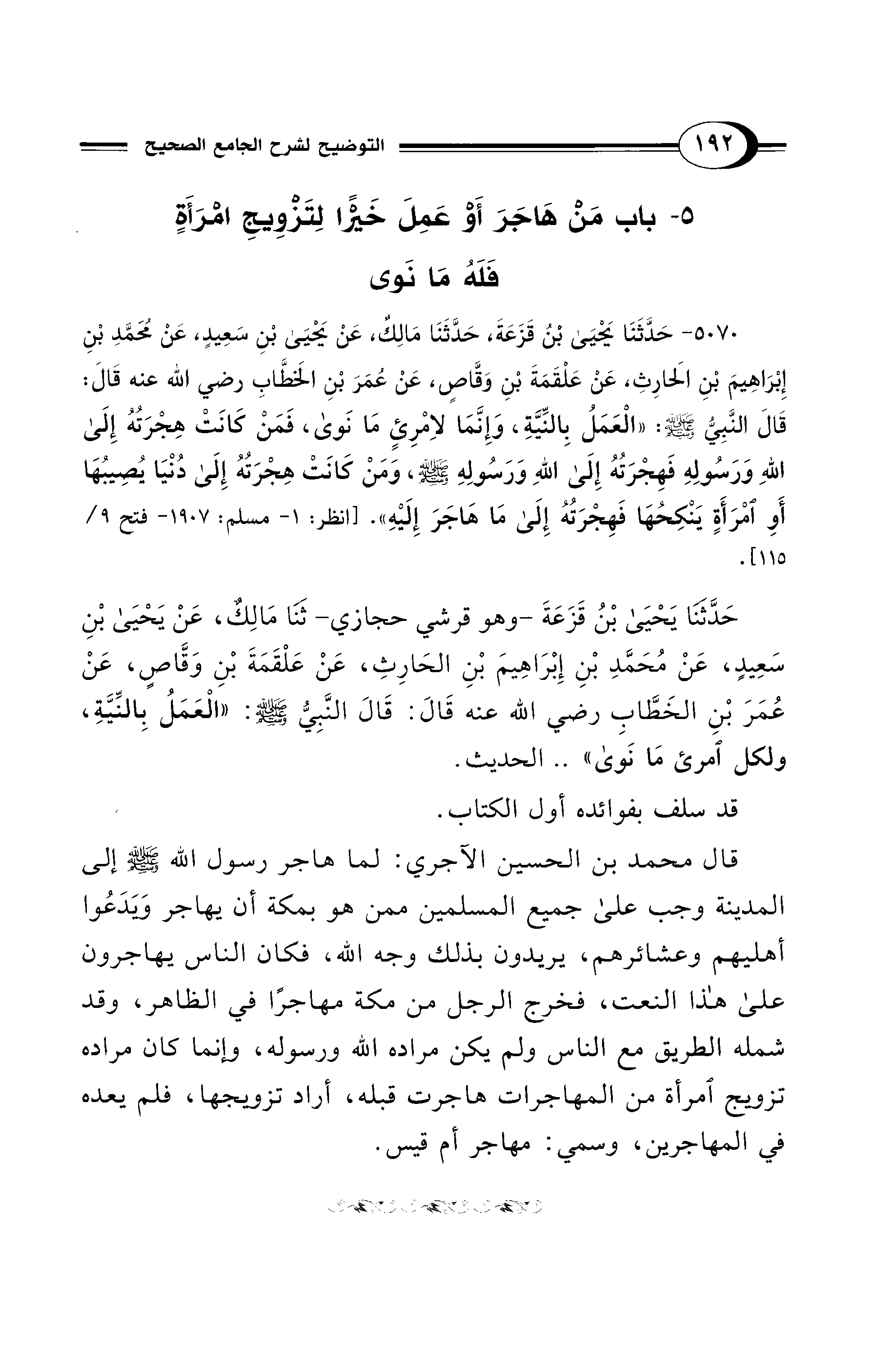 5070 - حَدَّثَنَا يَحْيَى بْنُ قَزَعَةَ, حَدَّثَنَا مَالِكٌ, عَنْ يَحْيَى بْنِ سَعِيدٍ, عَنْ مُحَمَّدِ بْنِ إِبْرَاهِيمَ بْنِ الْحَارِثِ, عَنْ عَلْقَمَةَ بْنِ وَقَّاصٍ, عَنْ عُمَرَ بْنِ الْخَطَّابِ - رضي الله عنه - قَالَ: قَالَ النَّبِيُّ - صلى الله عليه وسلم -: «الْعَمَلُ بِالنِّيَّةِ، وَإِنَّمَا لاِمْرِئٍ مَا نَوَى، فَمَنْ كَانَتْ هِجْرَتُهُ إِلَى اللهِ وَرَسُولِهِ فَهِجْرَتُهُ إِلَى اللهِ وَرَسُولِهِ - صلى الله عليه وسلم - وَمَنْ كَانَتْ هِجْرَتُهُ إِلَى دُنْيَا يُصِيبُهَا أَوِ امْرَأَةٍ يَنْكِحُهَا، فَهِجْرَتُهُ إِلَى مَا هَاجَرَ إِلَيْهِ». [انظر: 1 - مسلم: 1907 - فتح 9/ 115].