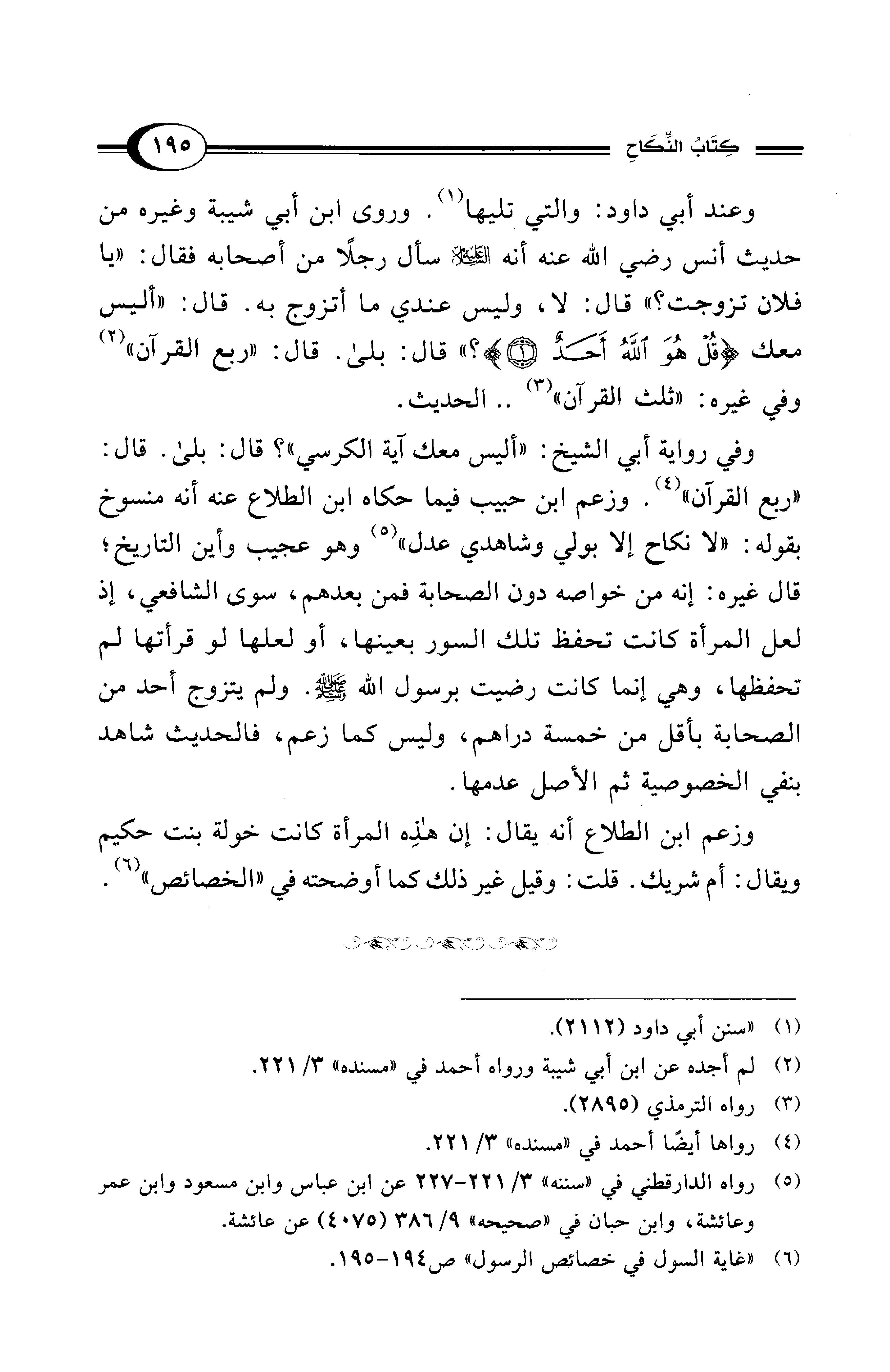 وفي رواية أبي الشيخ: "أليس معك آية الكرسي"؟ قال: بلى. قال: "ربع القرآن" (¬4). وزعم ابن حبيب فيما حكاه ابن الطلاع عنه أنه منسوخ بقوله: "لا نكاح إلا بولي وشاهدي عدل" (¬5) وهو عجيب وأين التاريخ؛ قال غيره: إنه من خواصه دون الصحابة فمن بعدهم، سوى الشافعي، إذ لعل المرأة كانت تحفظ تلك السور بعينها، أو لعلها لو قرأتها لم تحفظها، وهي إنما كانت رضيت برسول الله - صلى الله عليه وسلم -. ولم يتزوج أحد من الصحابة بأقل من خمسة دراهم، وليس كما زعم، فالحديث شاهد بنفي الخصوصية ثم الأصل عدمها.