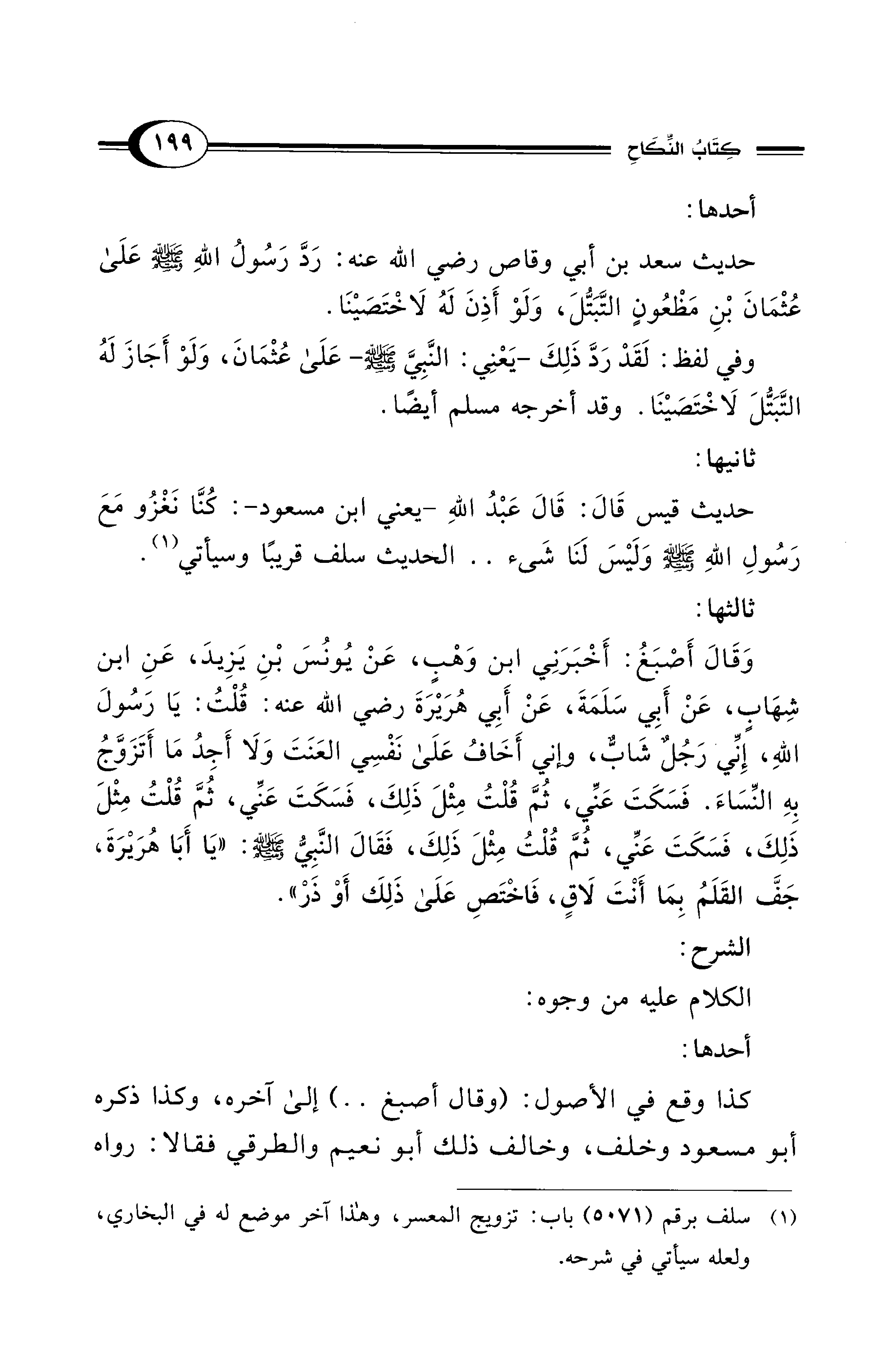 حديث سعد بن أبي وقاص رضي الله عنه: رَدَّ رَسُولُ اللهِ - صلى الله عليه وسلم - علَى عُثْمَانَ بْنِ مَظْعُونٍ التَّبَتُّلَ، وَلَوْ أَذِنَ لَهُ لَاخْتَصَيْنَا.