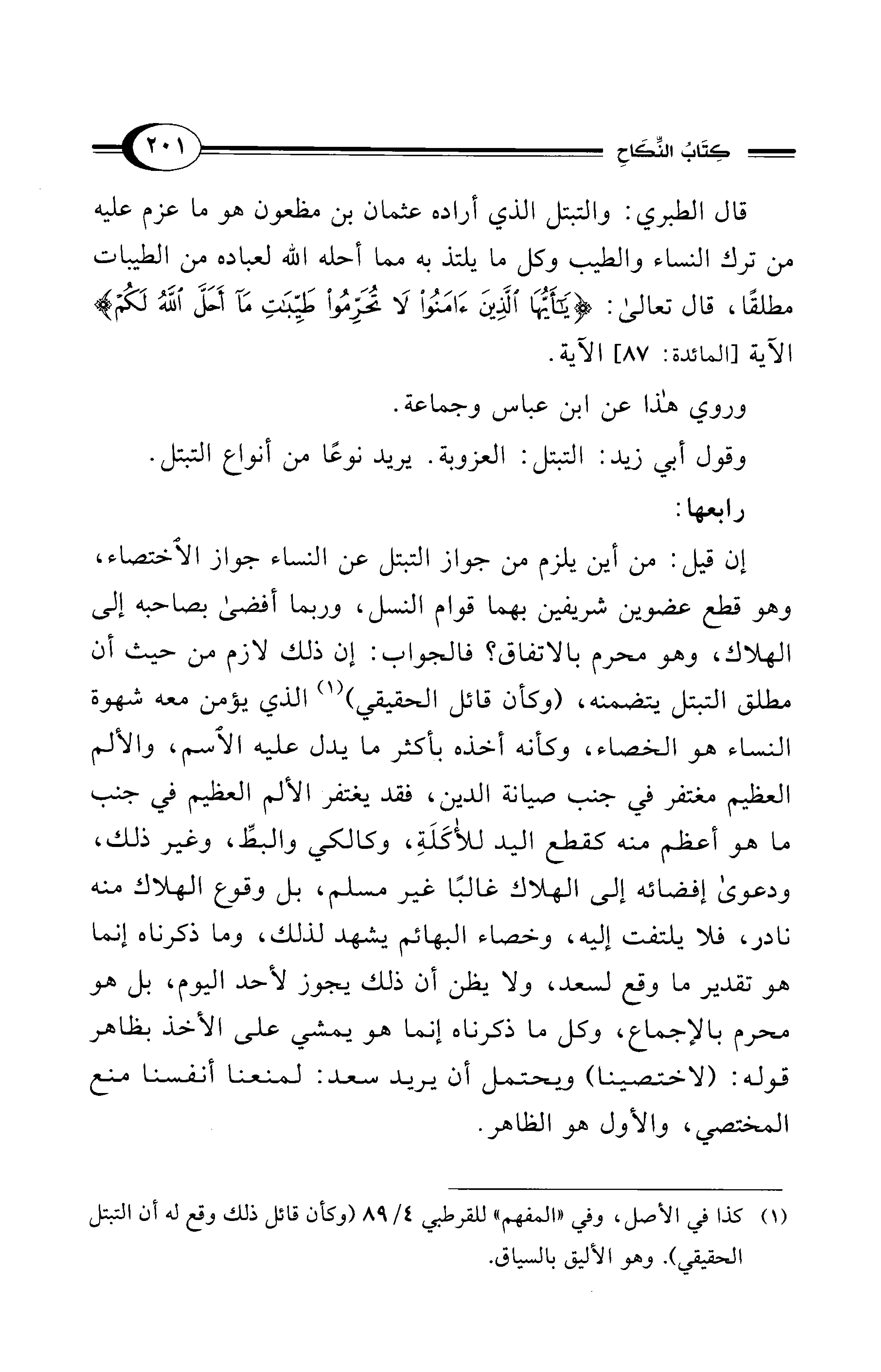 قال الطبري: والتبتل الذي أراده عثمان بن مظعون هو ما عزم عليه من ترك النساء: والطيب وكل ما يلتذ به مما أحله الله لعباده من الطيبات مطلقًا، قال تعالى: {يَا أَيُّهَا الَّذِينَ آمَنُوا لَا تُحَرِّمُوا طَيِّبَاتِ مَا أَحَلَّ اللهُ لَكُمْ} الآية [المائدة: 87] الآية.
