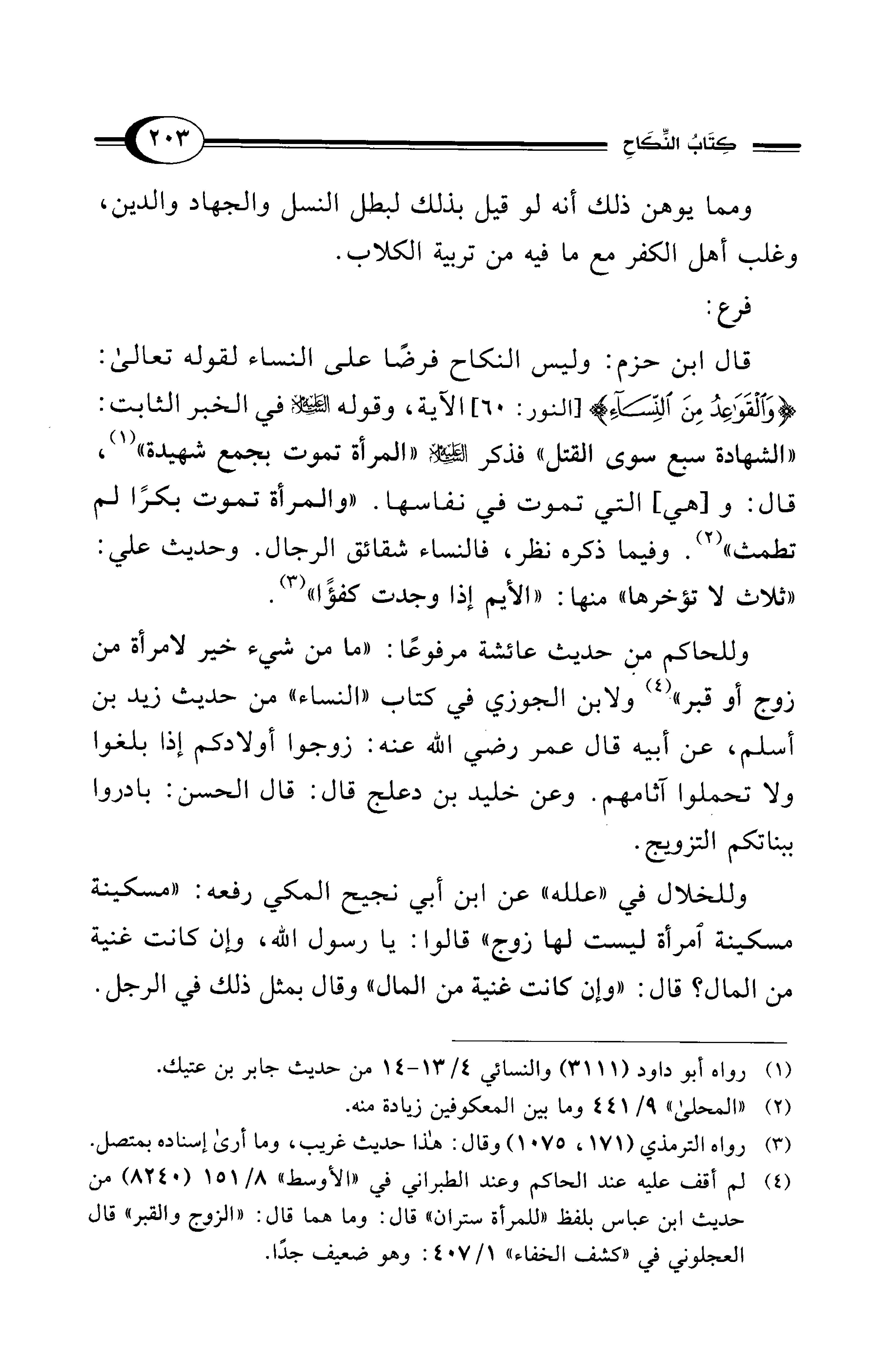 قال ابن حزم: وليس النكاح فرضًا على النساء: لقوله تعالى: {وَالْقَوَاعِدُ مِنَ النِّسَاءِ} [النور: 60] الآية، وقوله - عليه السلام - في الخبر الثابت: "الشهادة سبع سوى القتل" فذكر - عليه السلام - "المرأة تموت بجمع شهيدة" (¬1)، قال: و [هي] التي تموت في نفاسها. "والمرأة تموت بكرًا لم تطمث" (¬2). وفيما ذكره نظر، فالنساء شقائق الرجال. وحديث علي: "ثلاث لا تؤخرها" منها: "الأيم إذا وجدت كفؤًا" (¬3).