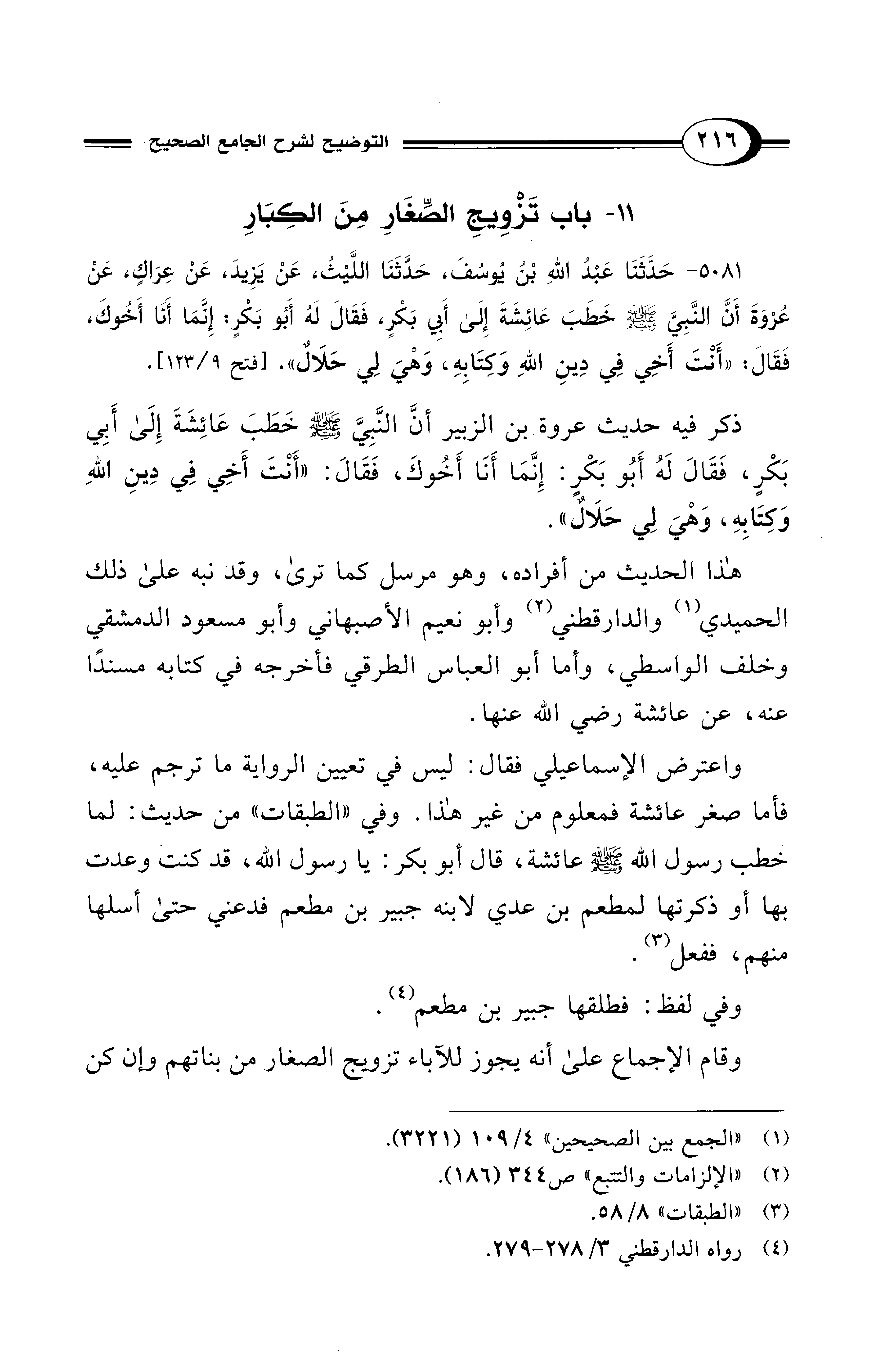 ذكر فيه حديث عروة بن الزبير أنَ النَّبِيَّ - صلى الله عليه وسلم - خَطَبَ عَائِشَةَ إلى أَبِي بَكْرٍ، فَقَالَ لَهُ أَبُو بَكْرٍ: إِنَّمَا أَنَا أَخُوكَ، فَقَالَ: "أَنْتَ أَخِي فِي دِينِ اللهِ وَكتَابِهِ، وَهْيَ لِي حَلَالٌ".
