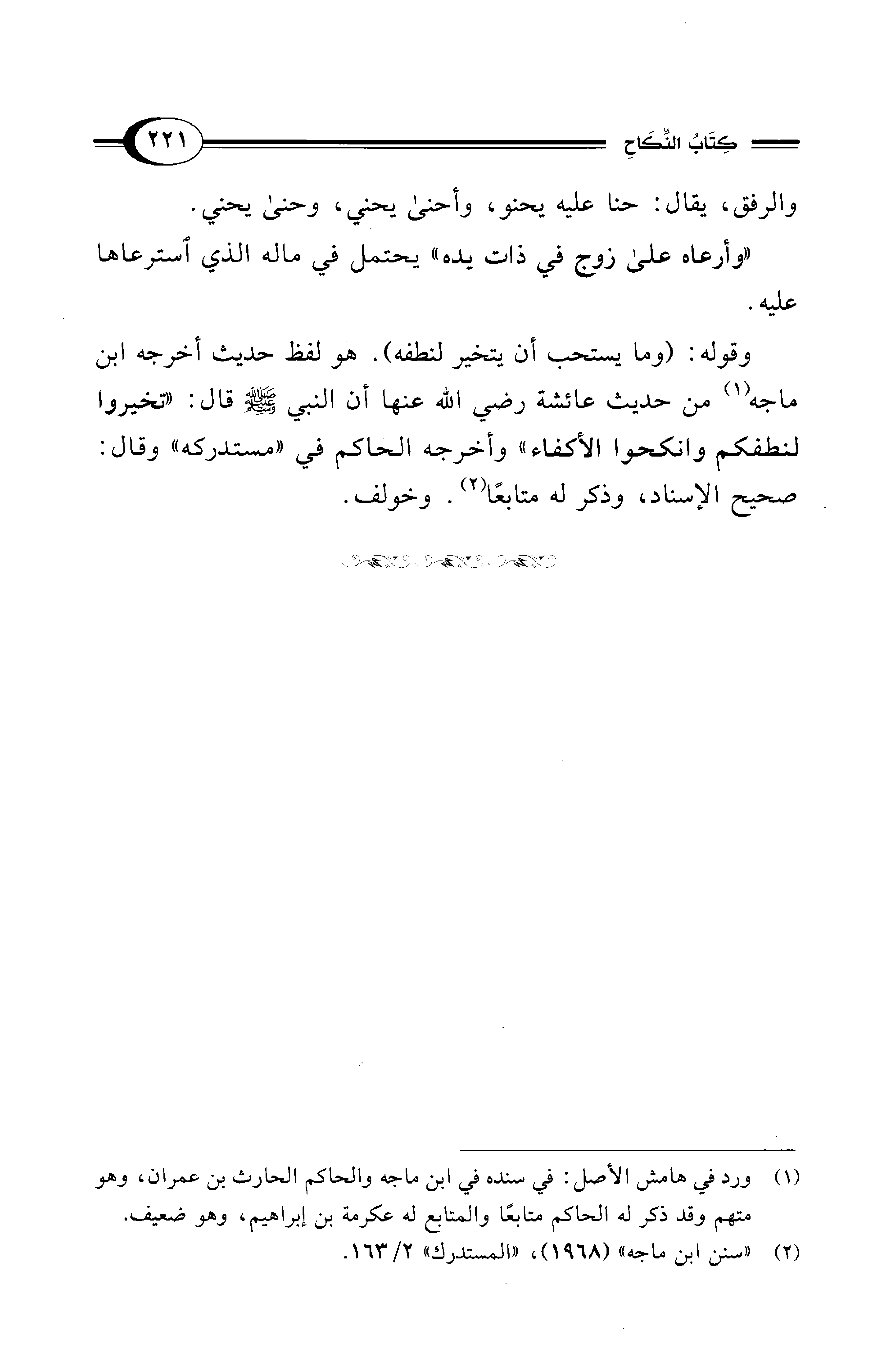 وقوله: (وما يستحب أن يتخير لنطفه). هو لفظ حديث أخرجه ابن ماجه (¬1) من حديث عائشة رضي الله عنها أن النبي - صلى الله عليه وسلم - قال: "تخيروا لنطفكم وانكحوا الأكفاء" وأخرجه الحاكم في "مستدركه" وقال: صحيح الإسناد، وذكر له متابعًا (¬2). وخولف.