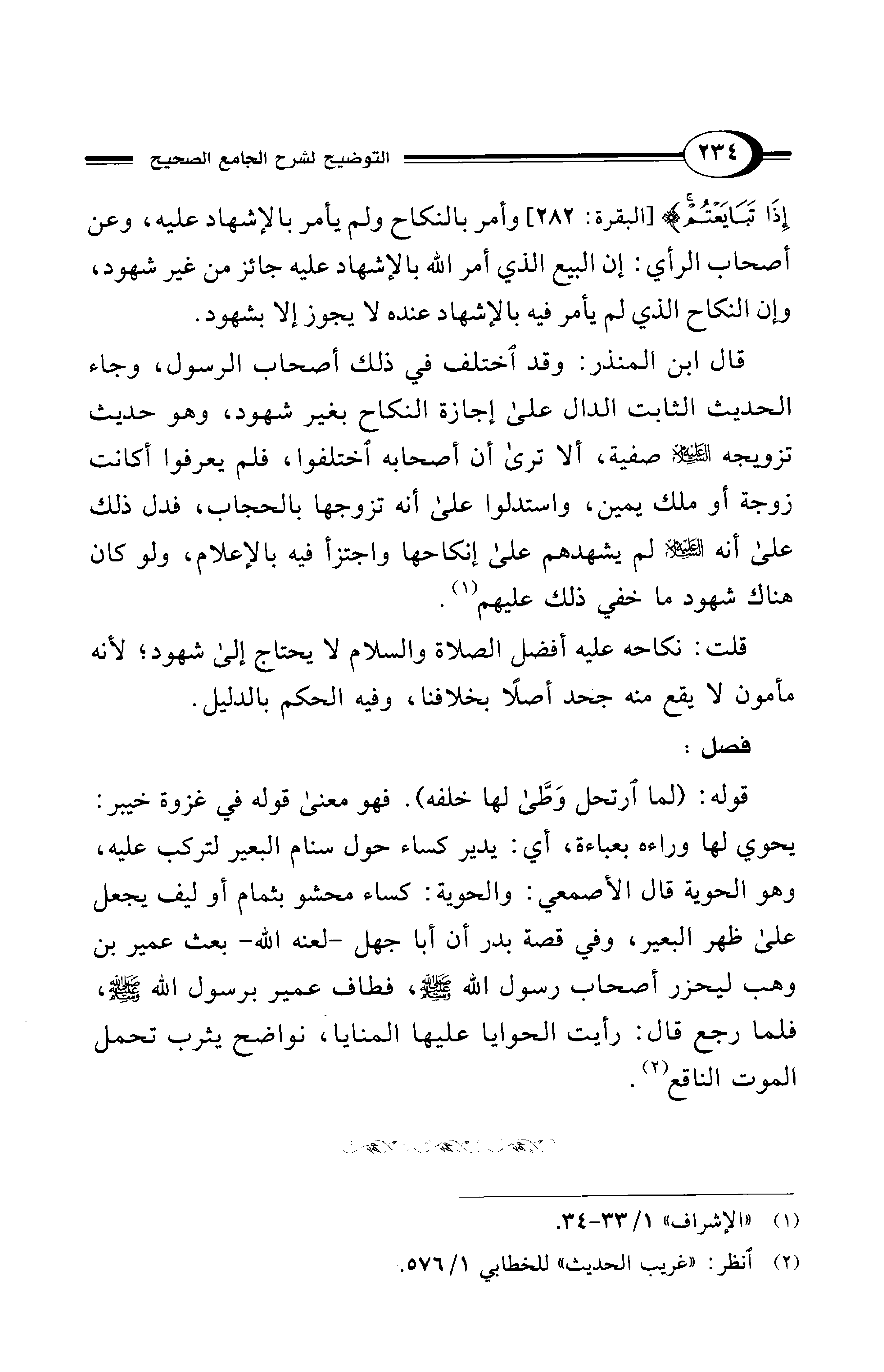 قال ابن المنذر: وقد اختلف في ذلك أصحاب الرسول، وجاء الحديث الثابت الدال على إجازة النكاح بغير شهود، وهو حديث تزويجه - عليه السلام - صفية، ألا ترى أن أصحابه اختلفوا، فلم يعرفوا أكانت زوجة أو ملك يمين، واستدلوا على أنه تزوجها بالحجاب، فدل ذلك على أنه - عليه السلام - لم يشهدهم على إنكاحها واجتزأ فيه بالإعلام، ولو كان هناك شهود ما خفي ذلك عليهم (¬1).