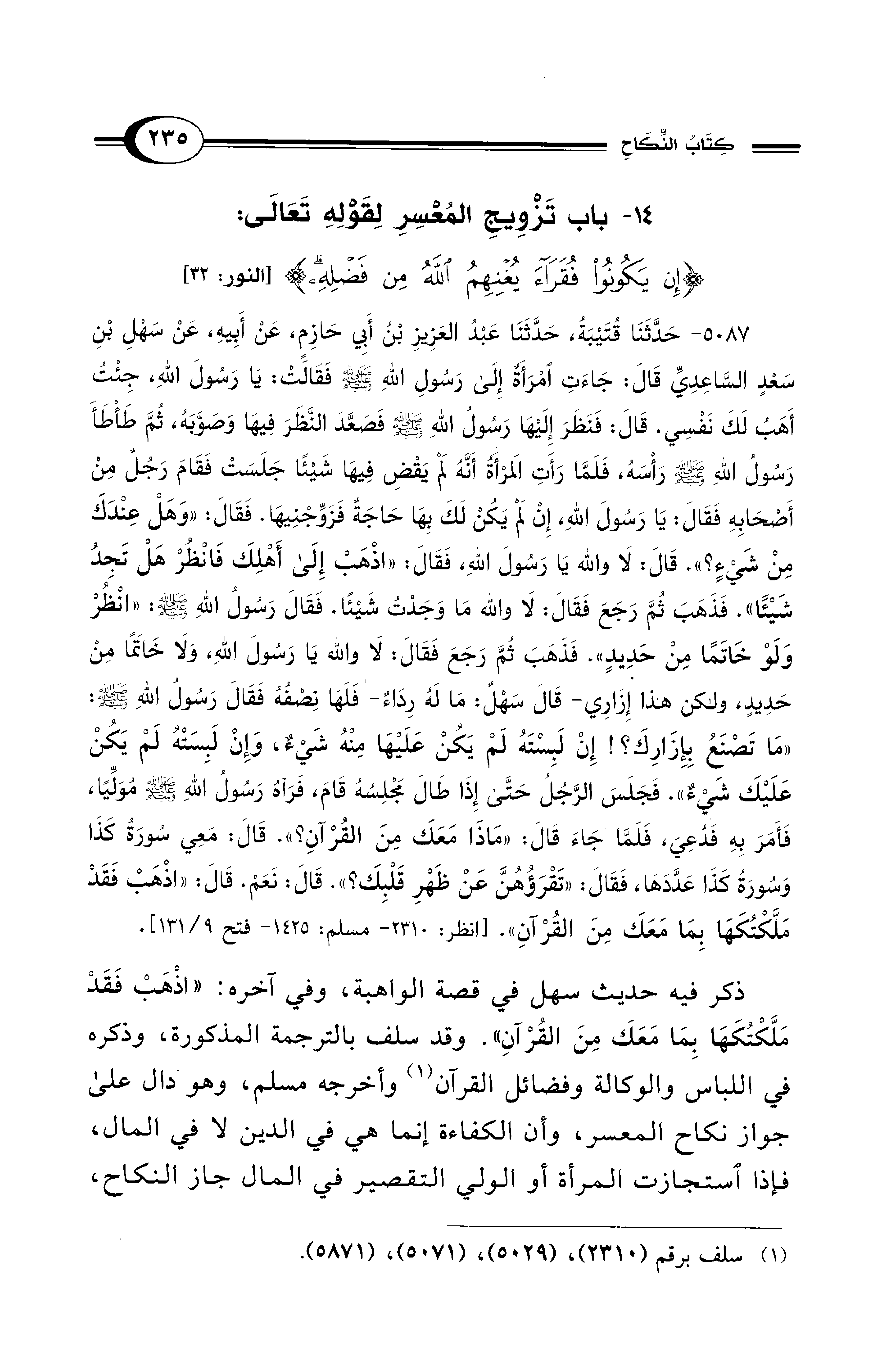 5087 - حَدَّثَنَا قُتَيْبَةُ, حَدَّثَنَا عَبْدُ الْعَزِيزِ بْنُ أَبِي حَازِمٍ, عَنْ أَبِيهِ, عَنْ سَهْلِ بْنِ سَعْدٍ السَّاعِدِيِّ قَالَ: جَاءَتِ امْرَأَةٌ إِلَى رَسُولِ اللهِ - صلى الله عليه وسلم - فَقَالَتْ: يَا رَسُولَ اللهِ, جِئْتُ أَهَبُ لَكَ نَفْسِي قَالَ: فَنَظَرَ إِلَيْهَا رَسُولُ اللهِ - صلى الله عليه وسلم - فَصَعَّدَ النَّظَرَ فِيهَا وَصَوَّبَهُ, ثُمَّ طَأْطَأَ رَسُولُ اللهِ - صلى الله عليه وسلم - رَأْسَهُ, فَلَمَّا رَأَتِ الْمَرْأَةُ أَنَّهُ لَمْ يَقْضِ فِيهَا شَيْئًا جَلَسَتْ فَقَامَ رَجُلٌ مِنْ أَصْحَابِهِ فَقَالَ: يَا رَسُولَ اللهِ, إِنْ لَمْ يَكُنْ لَكَ بِهَا حَاجَةٌ فَزَوِّجْنِيهَا. فَقَالَ: «وَهَلْ عِنْدَكَ مِنْ شَيْءٍ؟». قَالَ: لاَ وَاللهِ يَا رَسُولَ اللهِ. فَقَالَ: «اذْهَبْ إِلَى أَهْلِكَ فَانْظُرْ هَلْ تَجِدُ شَيْئًا». فَذَهَبَ ثُمَّ رَجَعَ فَقَالَ: لاَ وَاللهِ مَا وَجَدْتُ شَيْئًا. فَقَالَ رَسُولُ اللهِ - صلى الله عليه وسلم -: «انْظُرْ وَلَوْ خَاتَمًا مِنْ حَدِيدٍ». فَذَهَبَ ثُمَّ رَجَعَ فَقَالَ: لاَ وَاللهِ يَا رَسُولَ اللهِ, وَلاَ خَاتَمًا مِنْ حَدِيدٍ وَلَكِنْ هَذَا إِزَارِي -قَالَ سَهْلٌ: مَا لَهُ رِدَاءٌ- فَلَهَا نِصْفُهُ فَقَالَ رَسُولُ اللهِ - صلى الله عليه وسلم -: «مَا تَصْنَعُ بِإِزَارِكَ؟! إِنْ لَبِسْتَهُ لَمْ يَكُنْ عَلَيْهَا مِنْهُ شَيْءٌ وَإِنْ لَبِسَتْهُ لَمْ يَكُنْ عَلَيْكَ شَيْءٌ». فَجَلَسَ الرَّجُلُ حَتَّى إِذَا طَالَ مَجْلِسُهُ قَامَ, فَرَآهُ رَسُولُ اللهِ - صلى الله عليه وسلم -: مُوَلِّيًا فَأَمَرَ بِهِ فَدُعِيَ, فَلَمَّا جَاءَ قَالَ: «مَاذَا مَعَكَ مِنَ الْقُرْآنِ؟». قَالَ: مَعِي سُورَةُ كَذَا وَسُورَةُ كَذَا عَدَّدَهَا. فَقَالَ: «تَقْرَؤُهُنَّ عَنْ ظَهْرِ قَلْبِكَ؟». قَالَ: نَعَمْ. قَالَ: «اذْهَبْ فَقَدْ مَلَّكْتُكَهَا بِمَا مَعَكَ مِنَ الْقُرْآنِ». [انظر: 3310 - مسلم: 1425 - فتح 9/ 131].