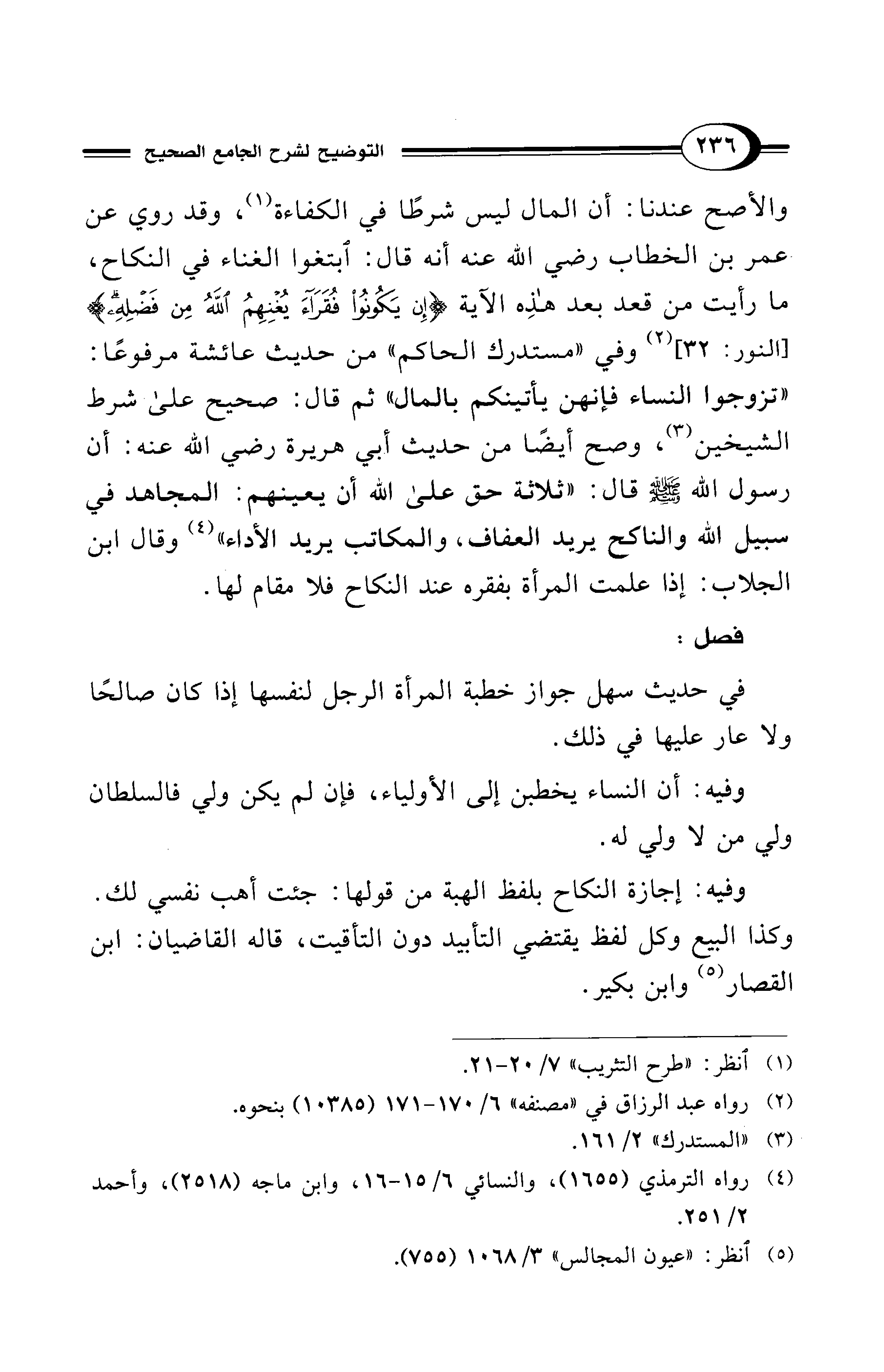 والأصح عندنا: أن المال ليس شرطًا في الكفاءة (¬1)، وقد روي عن - عمر بن الخطاب رضي الله عنه أنه قال: ابتغوا الغناء في النكاح، ما رأيت من قعد بعد هذِه الآية {إِنْ يَكُونُوا فُقَرَاءَ يُغْنِهِمُ اللهُ مِنْ فَضْلِهِ} [النور: 32] (¬2) وفي "مستدرك الحاكم" من حديث عائشة مرفوعًا: "تزوجوا النساء: فإنهن يأتينكم بالمال" ثم قال: صحيح على شرط الشيخين (¬3)، وصح أيضا من حديث أبي هريرة رضي الله عنه: أن رسول الله - صلى الله عليه وسلم - قال: "ثلاثة حق على الله أن يعينهم: المجاهد في سبيل الله والناكح يريد العفاف، والمكاتب يريد الأداء" (¬4) وقال ابن الجلاب: إذا علمت المرأة بفقره عند النكاح فلا مقام لها.