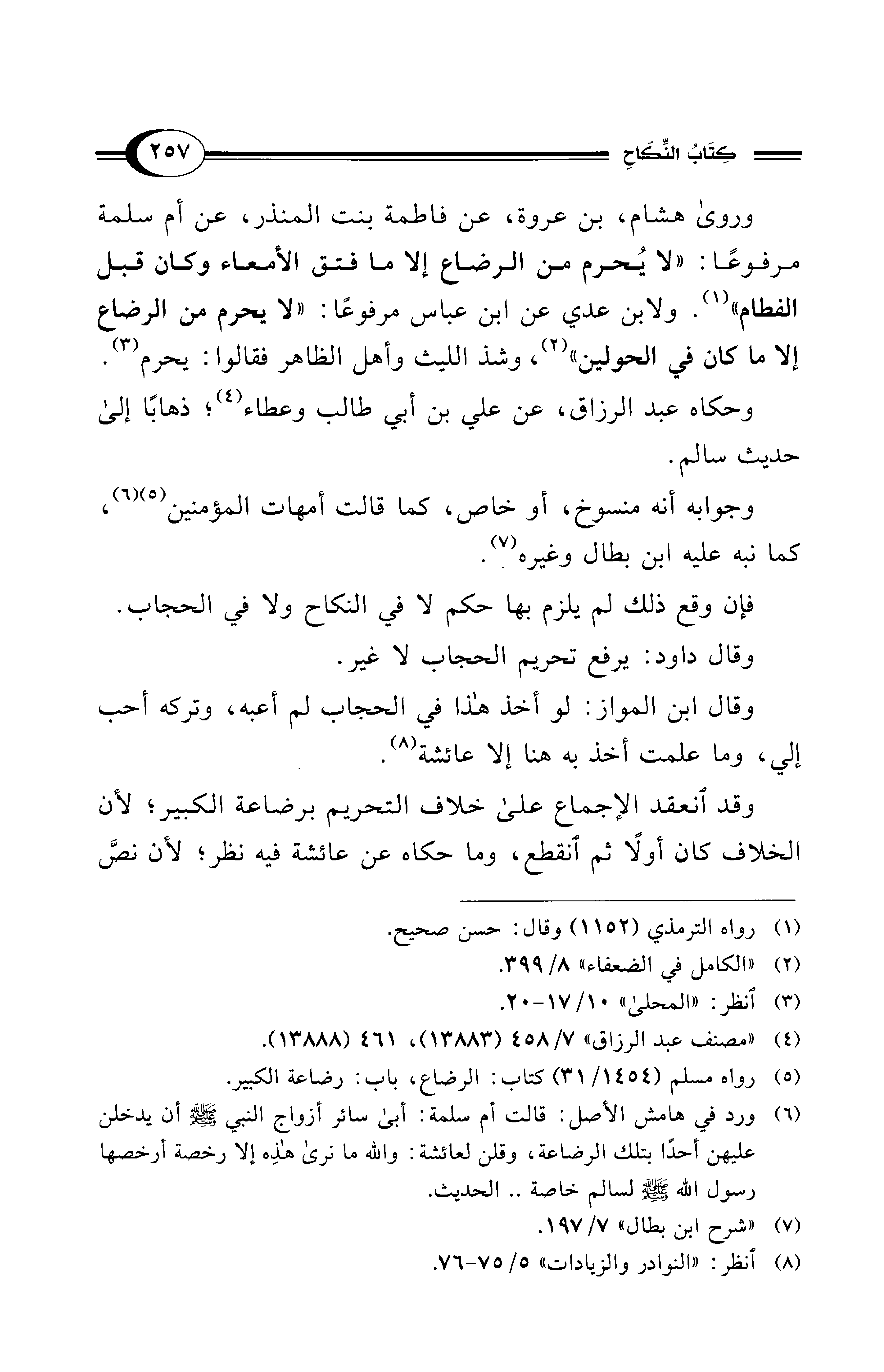 (¬6) ورد في هامش الأصل: قالت أم سلمة: أبى سائر أزواج النبي - صلى الله عليه وسلم - أن يدخلن عليهن أحدًا بتلك الرضاعة، وقلن لعائشة: والله ما نرى هذِه إلا رخصة أرخصها رسول الله - صلى الله عليه وسلم - لسالم خاصة .. الحديث.