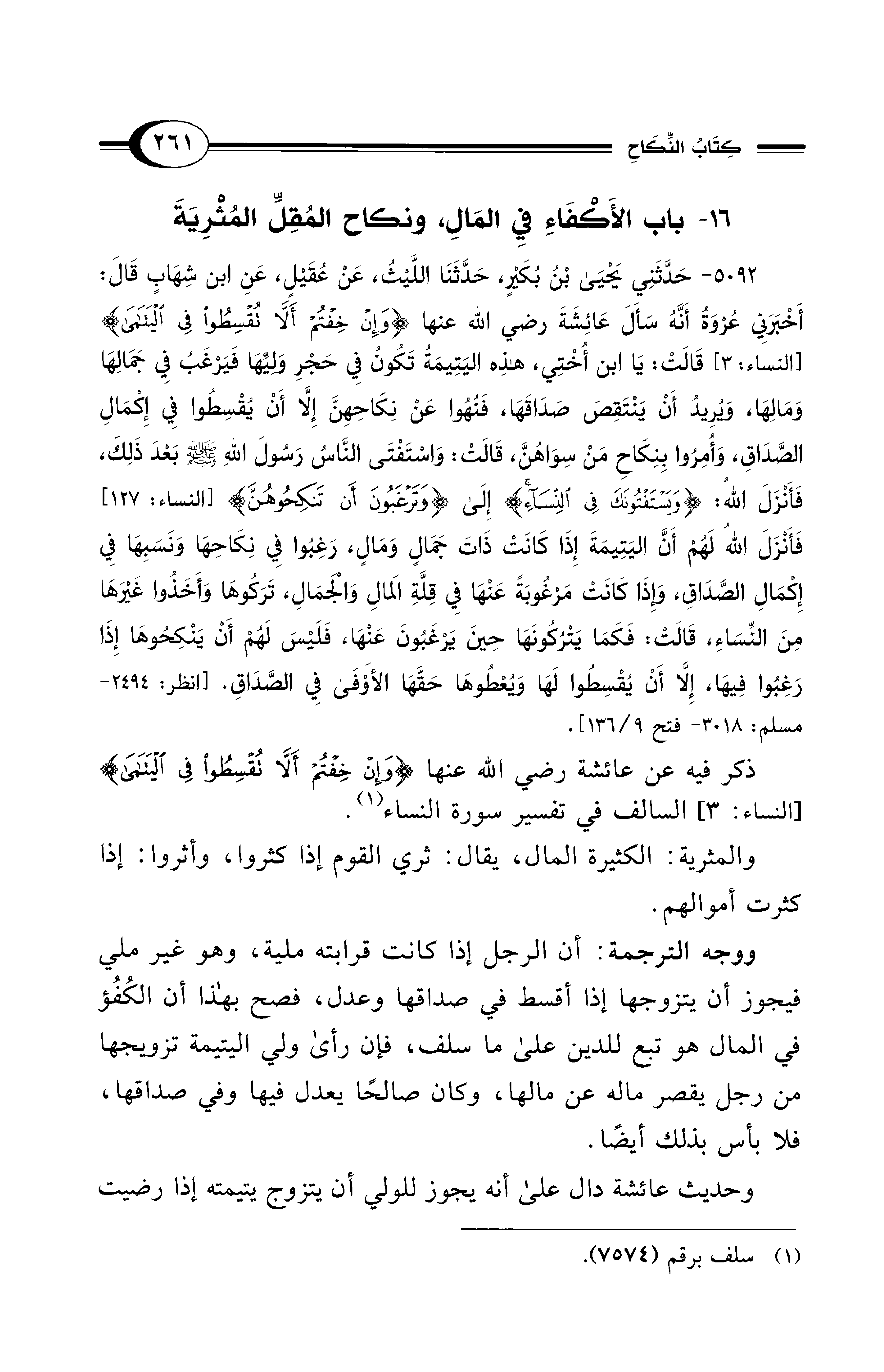 5092 - حَدَّثَنِي يَحْيَى بْنُ بُكَيْرٍ, حَدَّثَنَا اللَّيْثُ, عَنْ عُقَيْلٍ, عَنِ ابْنِ شِهَابٍ قَالَ: أَخْبَرَنِي عُرْوَةُ أَنَّهُ سَأَلَ عَائِشَةَ - رضي الله عنها - {وَإِنْ خِفْتُمْ أَنْ لاَ تُقْسِطُوا فِي الْيَتَامَى} [النساء: 3] قَالَتْ: يَا ابْنَ أُخْتِي, هَذِهِ الْيَتِيمَةُ تَكُونُ فِي حَجْرِ وَلِيِّهَا فَيَرْغَبُ فِي جَمَالِهَا وَمَالِهَا، وَيُرِيدُ أَنْ يَنْتَقِصَ صَدَاقَهَا، فَنُهُوا عَنْ نِكَاحِهِنَّ إِلاَّ أَنْ يُقْسِطُوا فِي إِكْمَالِ الصَّدَاقِ، وَأُمِرُوا بِنِكَاحِ مَنْ سِوَاهُنَّ، قَالَتْ: وَاسْتَفْتَى النَّاسُ رَسُولَ اللهِ - صلى الله عليه وسلم - بَعْدَ ذَلِكَ، فَأَنْزَلَ اللهُ: {وَيَسْتَفْتُونَكَ فِي النِّسَاءِ} إِلَى {وَتَرْغَبُونَ أَنْ تَنْكِحُوهُنَّ} [النساء: 3] فَأَنْزَلَ اللهُ لَهُمْ أَنَّ الْيَتِيمَةَ إِذَا كَانَتْ ذَاتَ جَمَالٍ وَمَالٍ رَغِبُوا فِي نِكَاحِهَا وَنَسَبِهَا فِي إِكْمَالِ الصَّدَاقِ، وَإِذَا كَانَتْ مَرْغُوبَةً عَنْهَا فِي قِلَّةِ الْمَالِ وَالْجَمَالِ, تَرَكُوهَا وَأَخَذُوا غَيْرَهَا مِنَ النِّسَاءِ، قَالَتْ: فَكَمَا يَتْرُكُونَهَا حِينَ يَرْغَبُونَ عَنْهَا, فَلَيْسَ لَهُمْ أَنْ يَنْكِحُوهَا إِذَا رَغِبُوا فِيهَا, إِلاَّ أَنْ يُقْسِطُوا لَهَا وَيُعْطُوهَا حَقَّهَا الأَوْفَى فِي الصَّدَاقِ. [انظر: 2494 - مسلم: 3018 - فتح 9/ 136].
