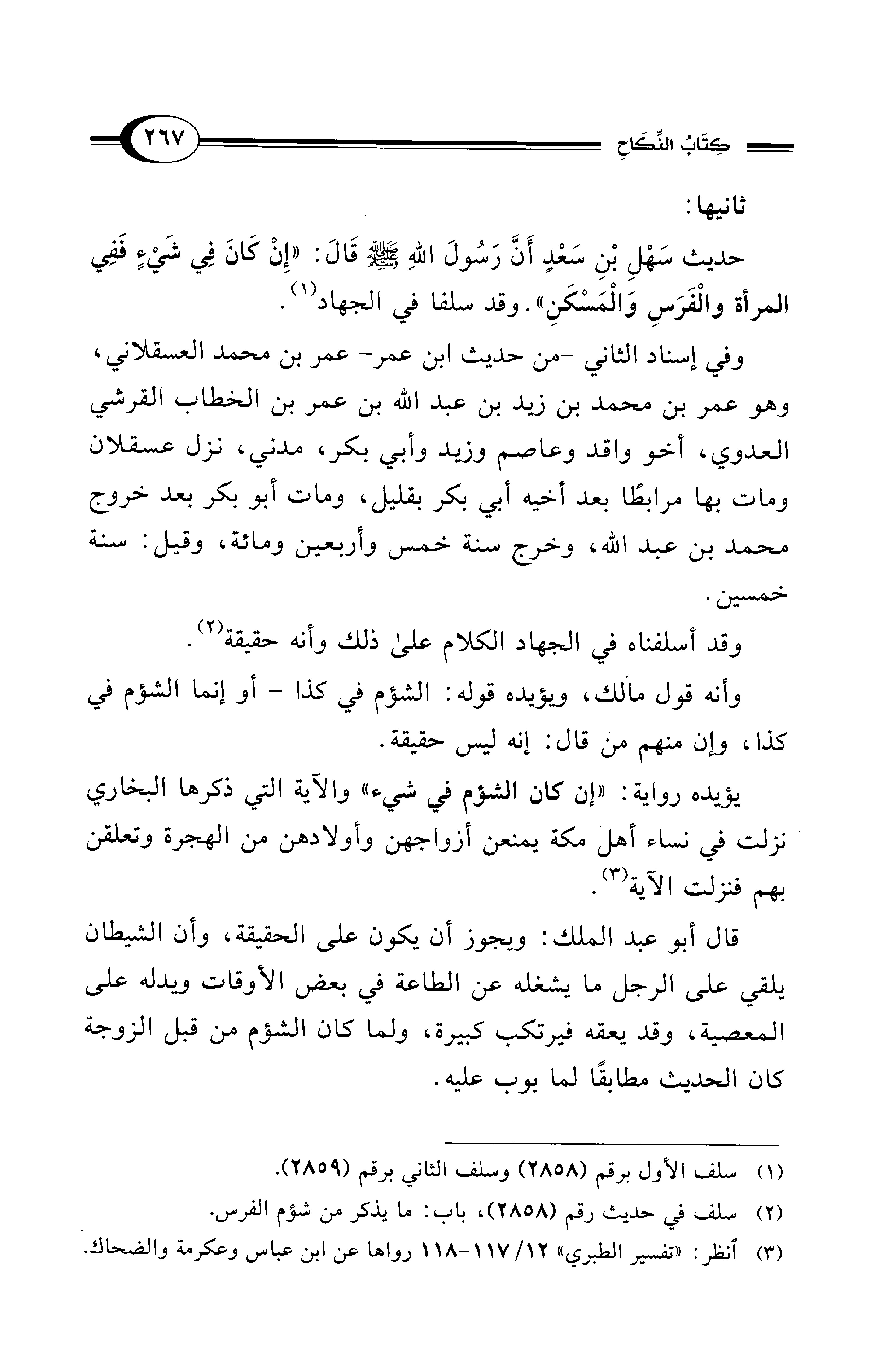 حديث سَهْلِ بْنِ سَعْدٍ أَنَّ رَسُولَ اللهِ - صلى الله عليه وسلم - قَالَ: "إِنْ كَانَ فِي شَيْءٍ فَفِي المرأة والْفَرَسِ وَالْمَسْكَنِ". وقد سلفا في الجهاد (¬1).