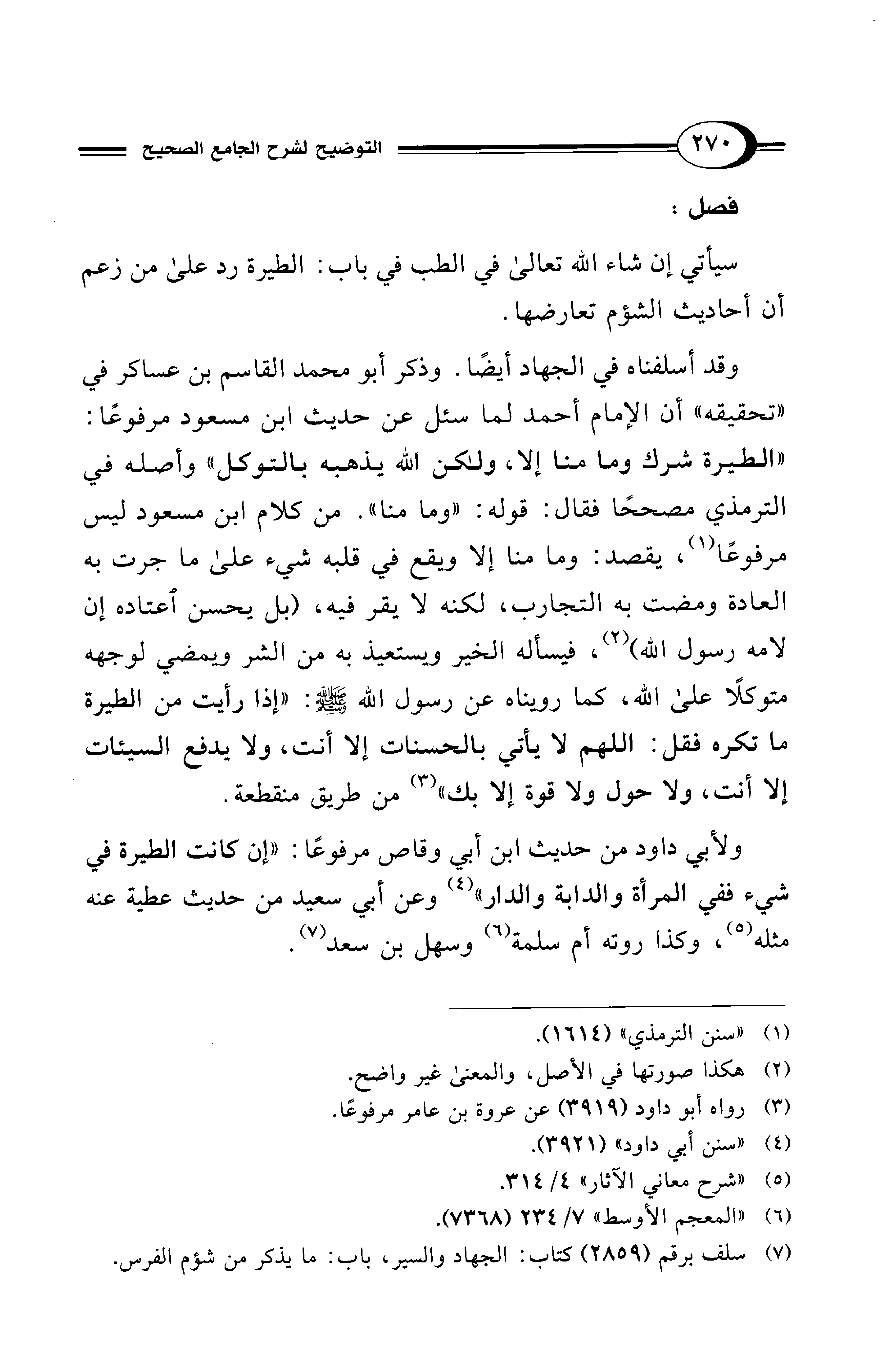 وقد أسلفناه في الجهاد أيضًا. وذكر أبو محمد القاسم بن عساكر في "تحقيقه" أن الإمام أحمد لما سئل عن حديث ابن مسعود مرفوعًا: "الطيرة شرك وما منا إلا، ولكن الله يذهبه بالتوكل" وأصله في الترمذي مصححًا فقال: قوله: "وما منا". من كلام ابن مسعود ليس مرفوعًا (¬1)، يقصد: وما منا إلا ويقع في قلبه شيء على ما جرت به العادة ومضت به التجارب، لكنه لا يقر فيه، (بل يحسن اعتاده إن لامه رسول الله) (¬2)، فيسأله الخير ويستعيذ به من الشر ويمضي لوجهه متوكلًا على الله، كما رويناه عن رسول الله - صلى الله عليه وسلم -: "إذا رأيت من الطيرة ما تكره فقل: اللهم لا يأتي بالحسنات إلا أنت، ولا يدفع السيئات إلا أنت، ولا حول ولا قوة إلا بك" (¬3) من طريق منقطعة.
