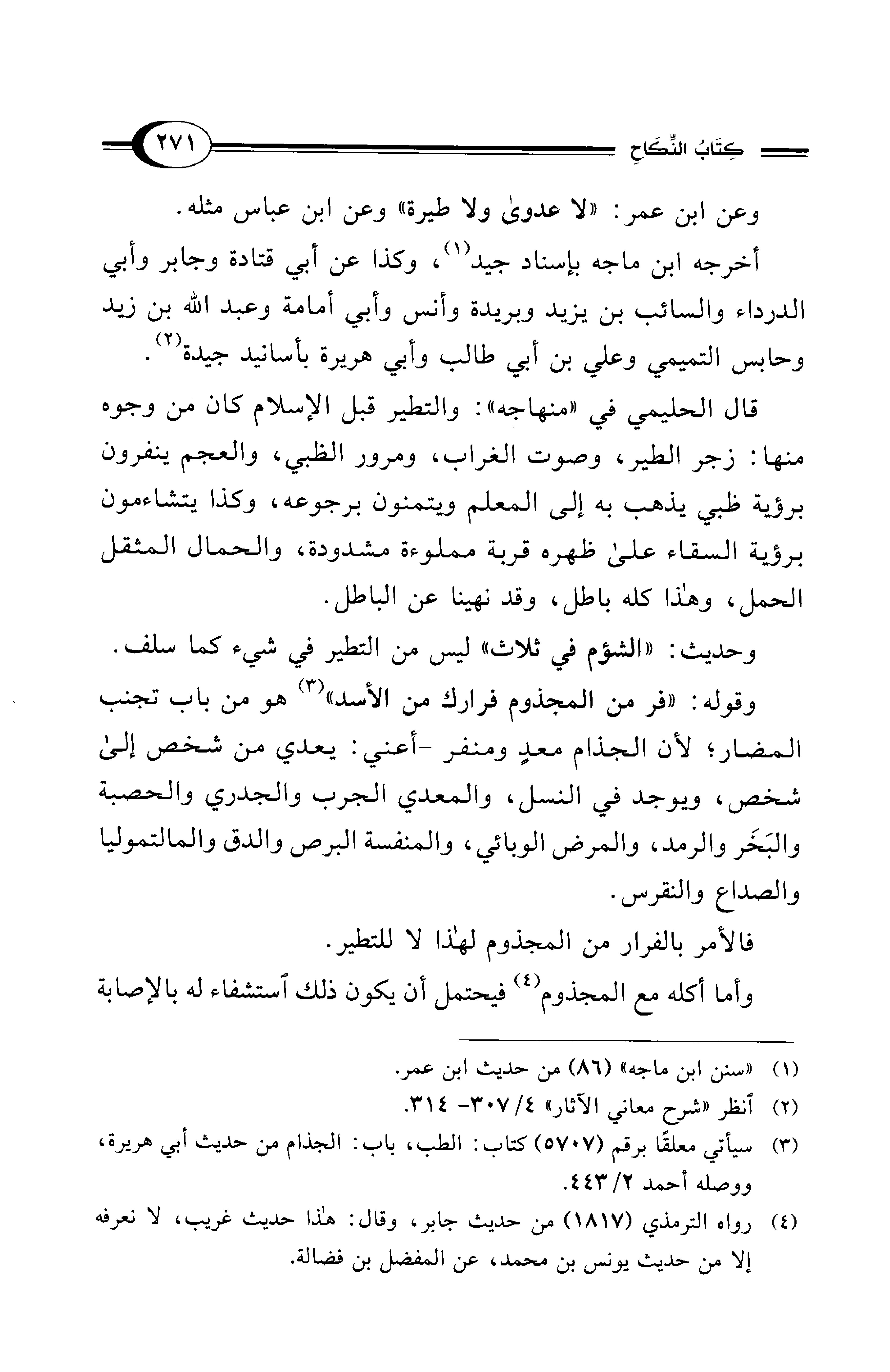 وقوله: "فر من المجذوم فرارك من الأسد" (¬3) هو من باب تجنب المضار؛ لأن الجذام معدٍ ومنفر -أعني: يعدي من شخص إلى شخص، ويوجد في النسل، والمعدي الجرب والجدري والحصبة والبَخَر والرمد، والمرض الوبائي، والمنفسة البرص والدق والمالتموليا والصداع والنقرس.