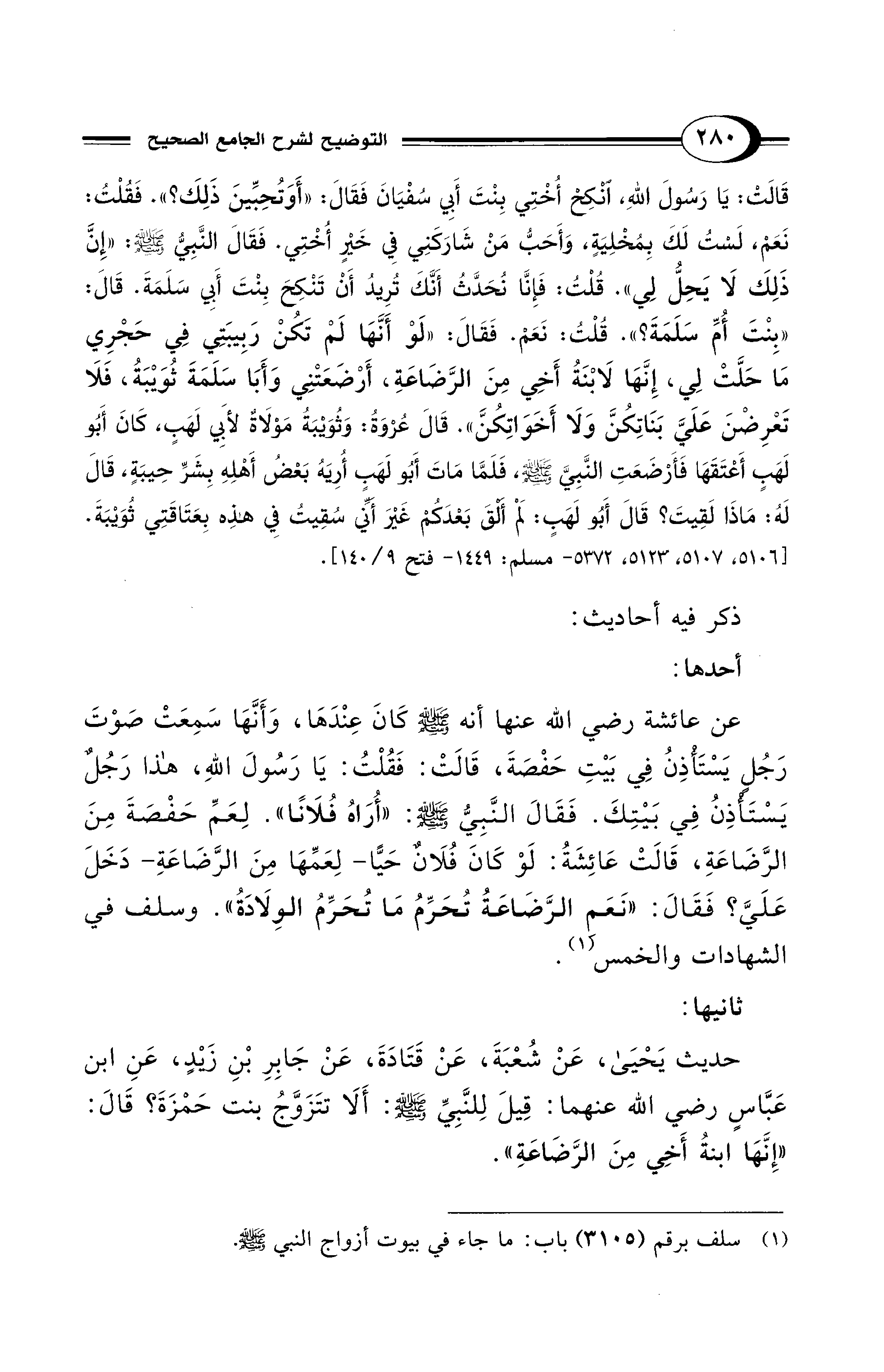 حديث يَحْيَى، عَنْ شُعْبَةَ، عَنْ قَتَادَةَ، عَنْ جَابِرِ بْنِ زَيْدٍ، عَنِ ابن عَبَّاسٍ - رضي الله عنهما -: قِيلَ لِلنَّبِيِّ - صلى الله عليه وسلم -: أَلَا تتَزَوَّجُ بنت حَمْزَةَ؟ قَالَ: "إِنَّهَا ابنةُ أَخِي مِنَ الرَّضَاعَةِ".