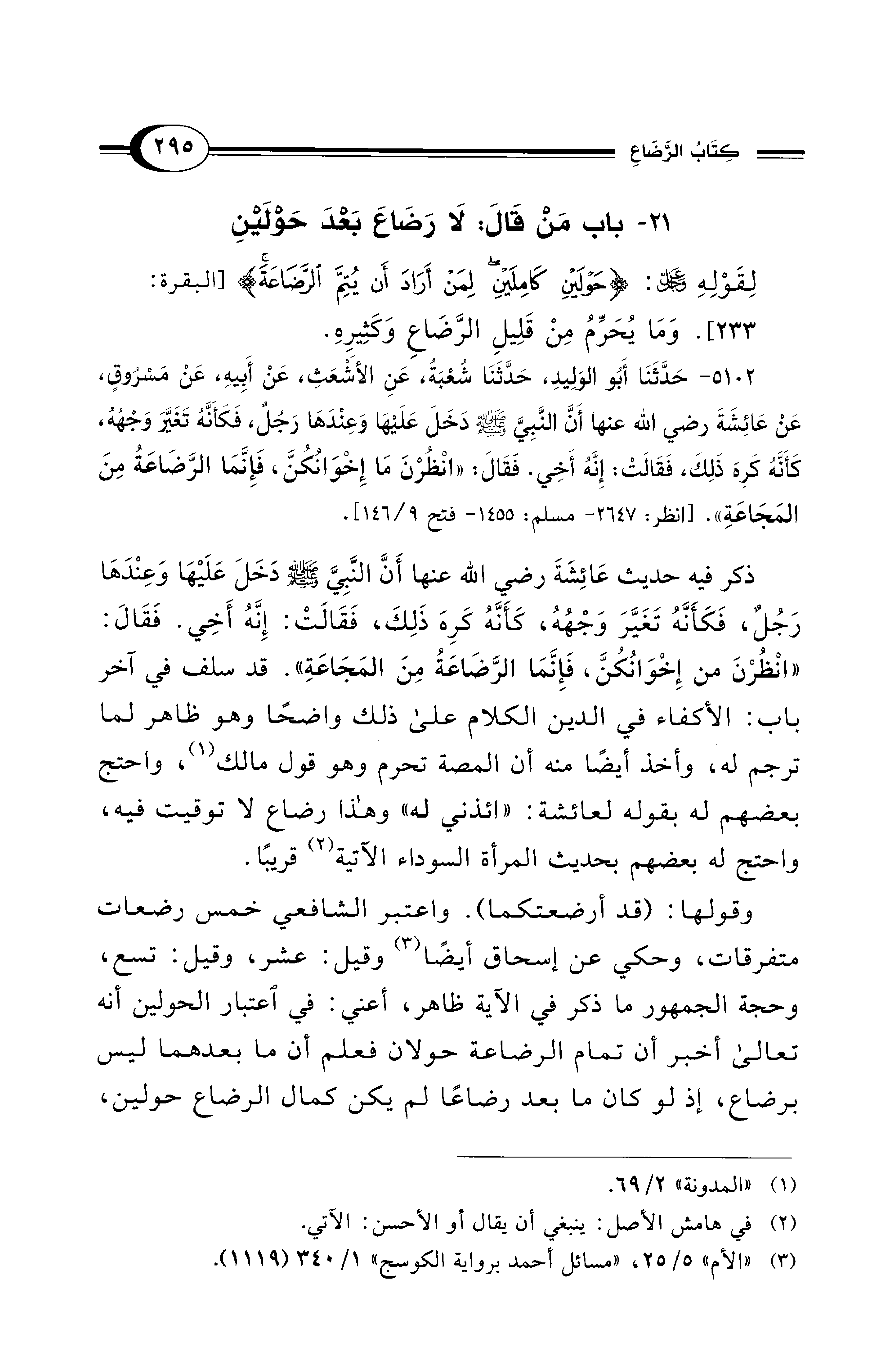 لِقَوْلِهِ -عَزَّ وَجَلَّ-: {حَوْلَيْنِ كَامِلَيْنِ لِمَنْ أَرَادَ أَنْ يُتِمَّ الرَّضَاعَةَ} [البقرة: 233]. وَمَا يُحَرِّمُ مِنْ قَلِيلِ الرَّضَاعِ وَكَثِيرِهِ.