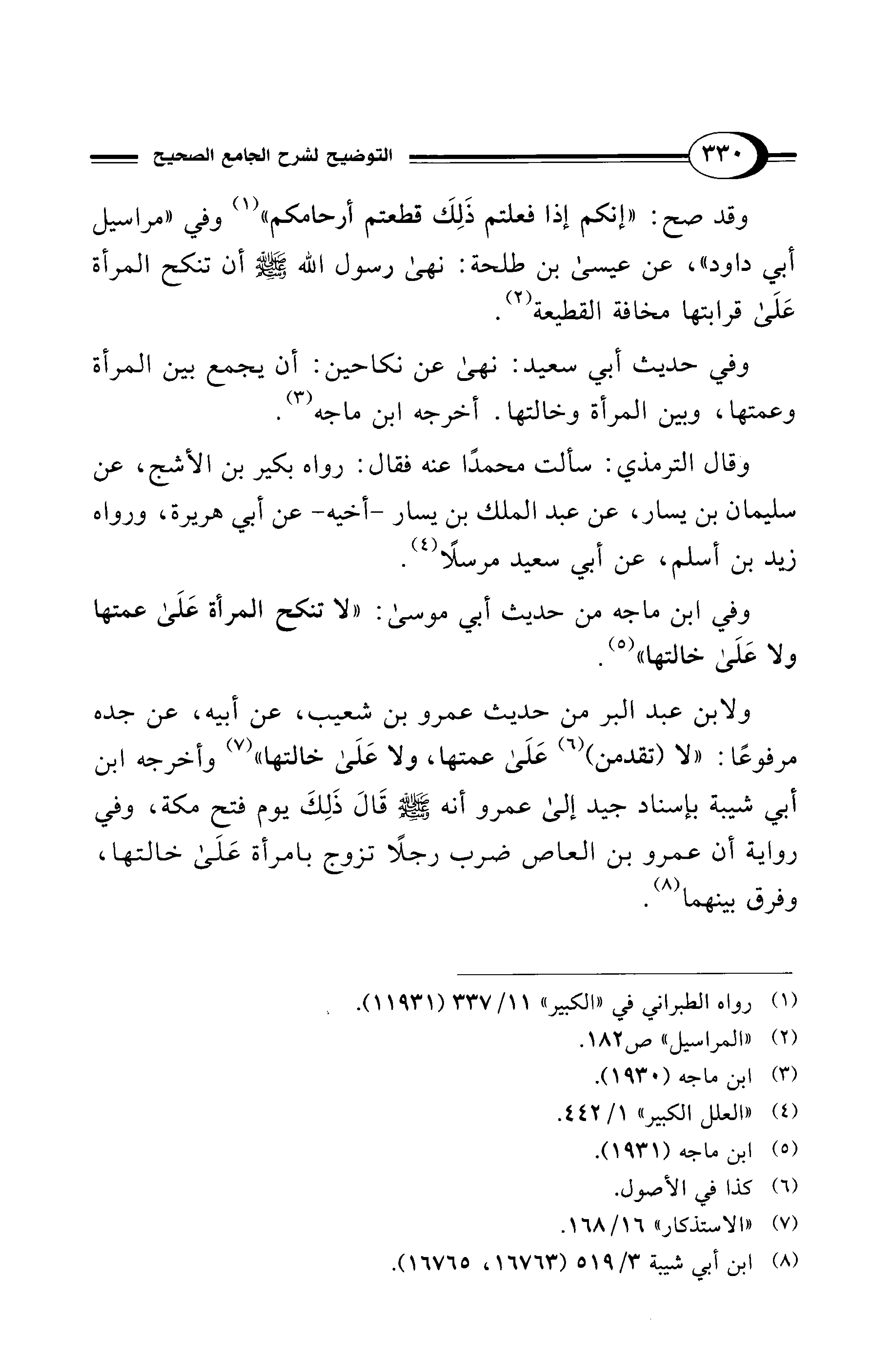 وقد صح: "إنكم إذا فعلتم ذَلِكَ قطعتم أرحامكم" (¬1) وفي "مراسيل أبي داود"، عن عيسى بن طلحة: نهى رسول الله - صلى الله عليه وسلم - أن تنكح المرأة عَلَى قرابتها مخافة القطيعة (¬2).
