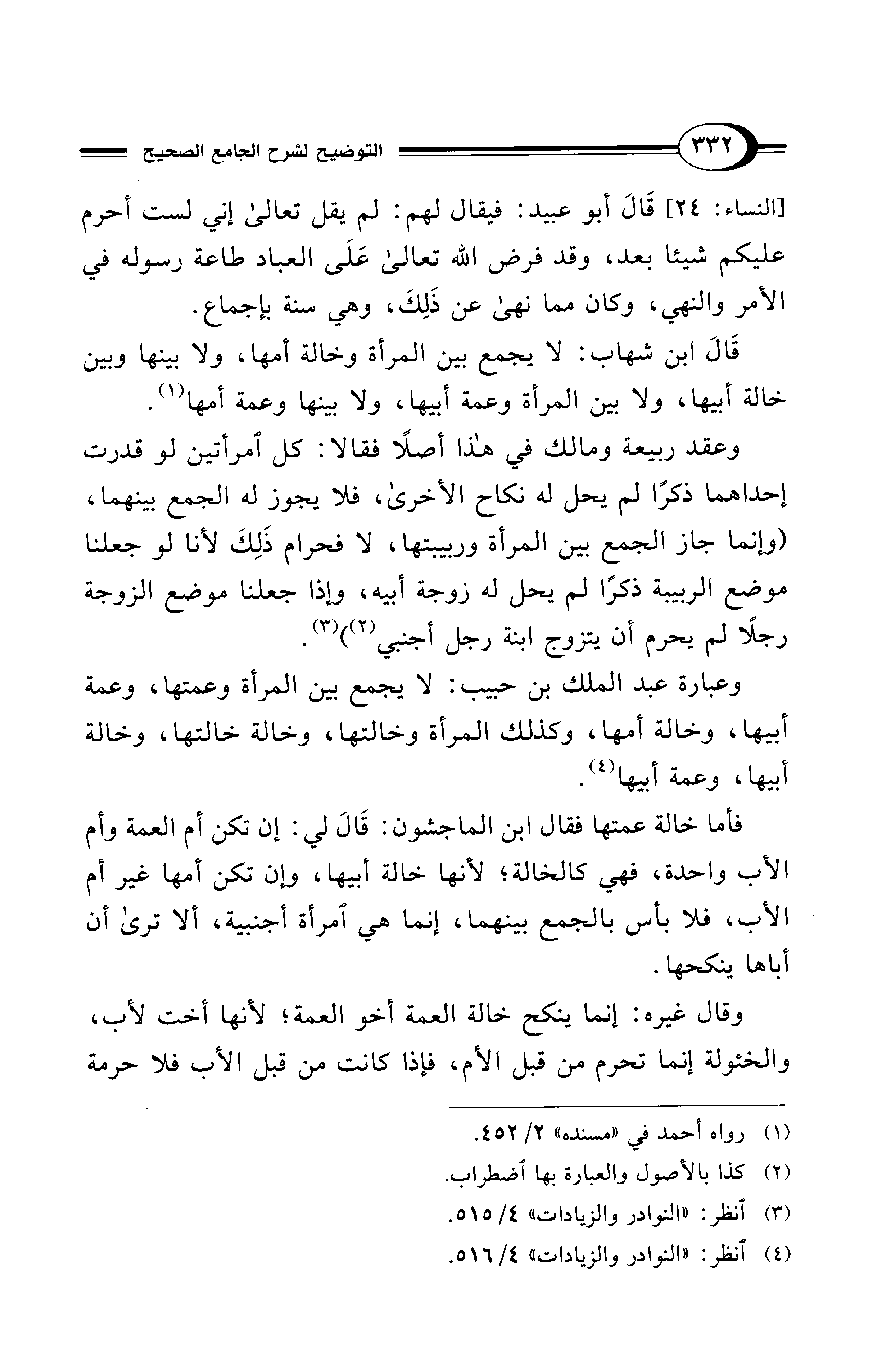 وعبارة عبد الملك بن حبيب: لا يجمع بين المرأة وعمتها، وعمة أبيها، وخالة أمها، وكذلك المرأة وخالتها، وخالة خالتها، وخالة أبيها، وعمة أبيها (¬4).