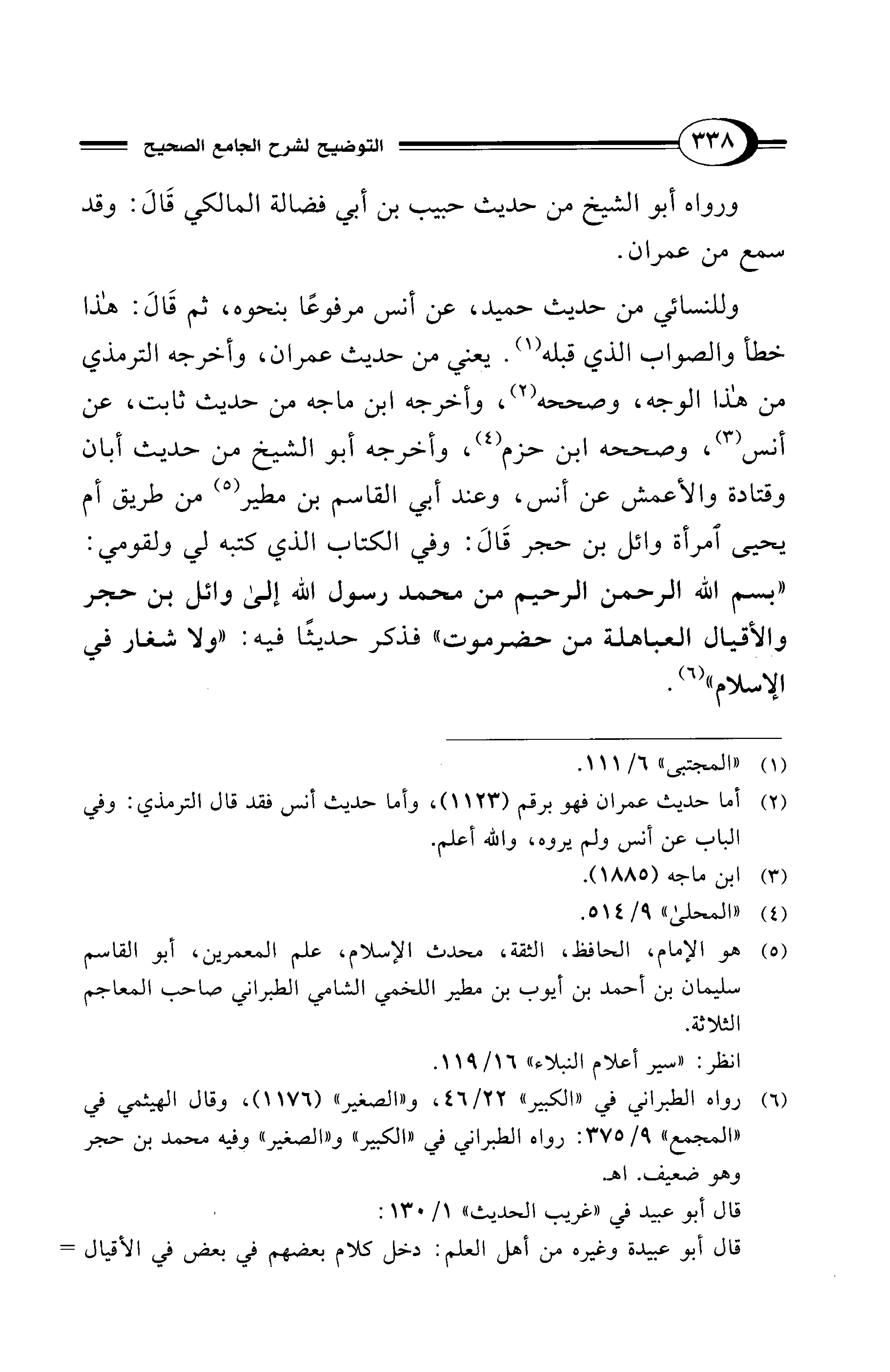 وللنسائي من حديث حميد، عن أنس مرفوعًا بنحوه، ثم قَالَ: هذا خطأ والصواب الذي قبله (¬1). يعني من حديث عمران، وأخرجه الترمذي من هذا الوجه، وصححه (¬2)، وأخرجه ابن ماجه من حديث ثابت، عن أنس (¬3)، وصححه ابن حزم (¬4)، وأخرجه أبو الشيخ من حديث أبان وقتادة والأعمش عن أنس، وعند أبي القاسم بن مطير (¬5) من طريق أم يحيى امرأة وائل بن حجر قَالَ: وفي الكتاب الذي كتبه لي ولقومي: "بسم الله الرحمن الرحيم من محمد رسول الله إلى وائل بن حجر والأقيال العباهلة من حضرموت" فذكر حديثًا فيه: "ولا شغار في الاسلام" (¬6).