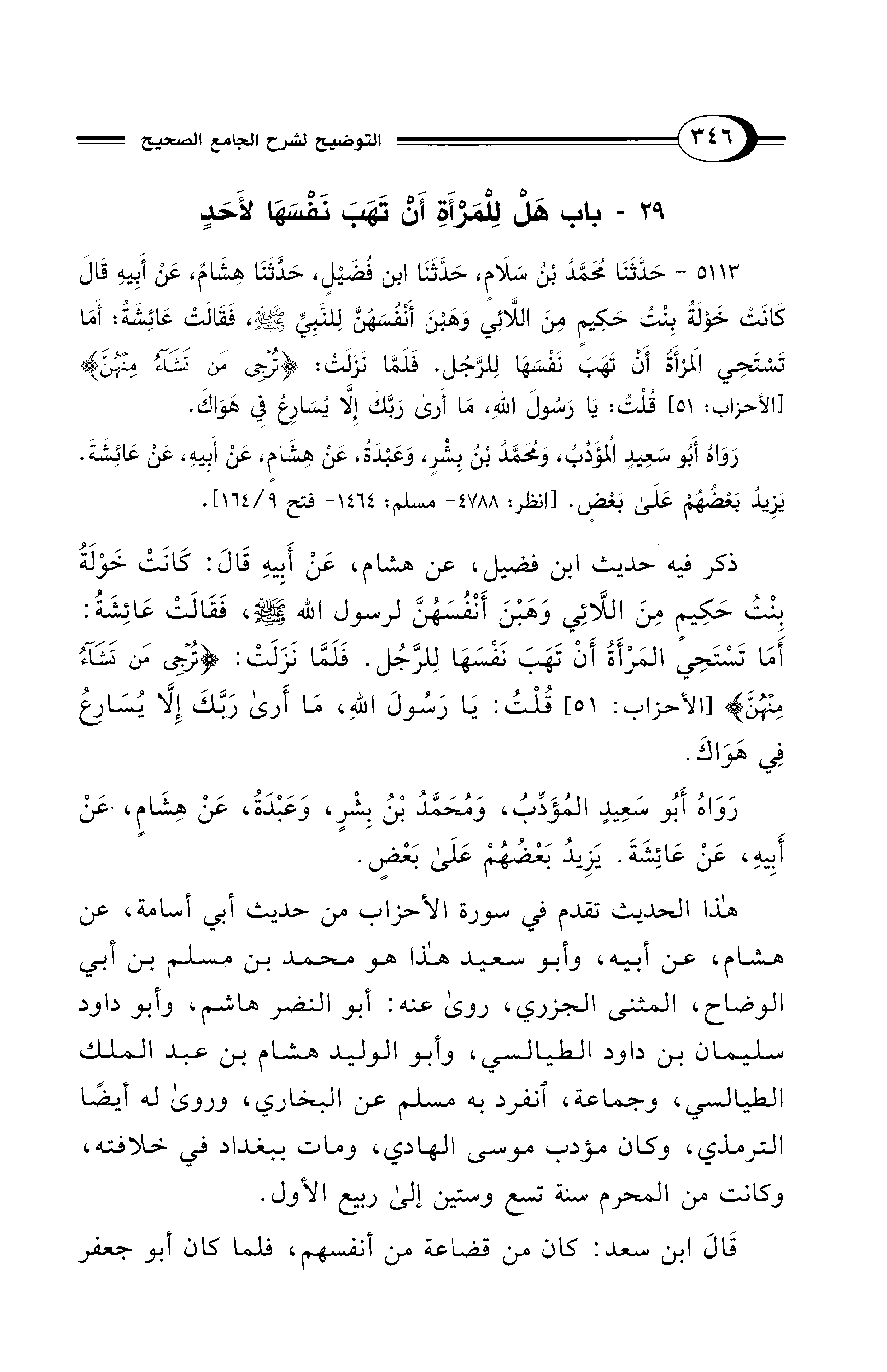 5113 - حَدَّثَنَا مُحَمَّدُ بْنُ سَلاَمٍ, حَدَّثَنَا ابْنُ فُضَيْلٍ, حَدَّثَنَا هِشَامٌ, عَنْ أَبِيهِ قَالَ كَانَتْ خَوْلَةُ بِنْتُ حَكِيمٍ مِنَ اللاَّئِي وَهَبْنَ أَنْفُسَهُنَّ لِلنَّبِيِّ - صلى الله عليه وسلم -, فَقَالَتْ عَائِشَةُ: أَمَا تَسْتَحِي الْمَرْأَةُ أَنْ تَهَبَ نَفْسَهَا لِلرَّجُلِ. فَلَمَّا نَزَلَتْ: {تُرْجِى مَنْ تَشَاءُ مِنْهُنَّ} [الأحزاب: 51] قُلْتُ: يَا رَسُولَ اللهِ, مَا أَرَى رَبَّكَ إِلاَّ يُسَارِعُ فِي هَوَاكَ.