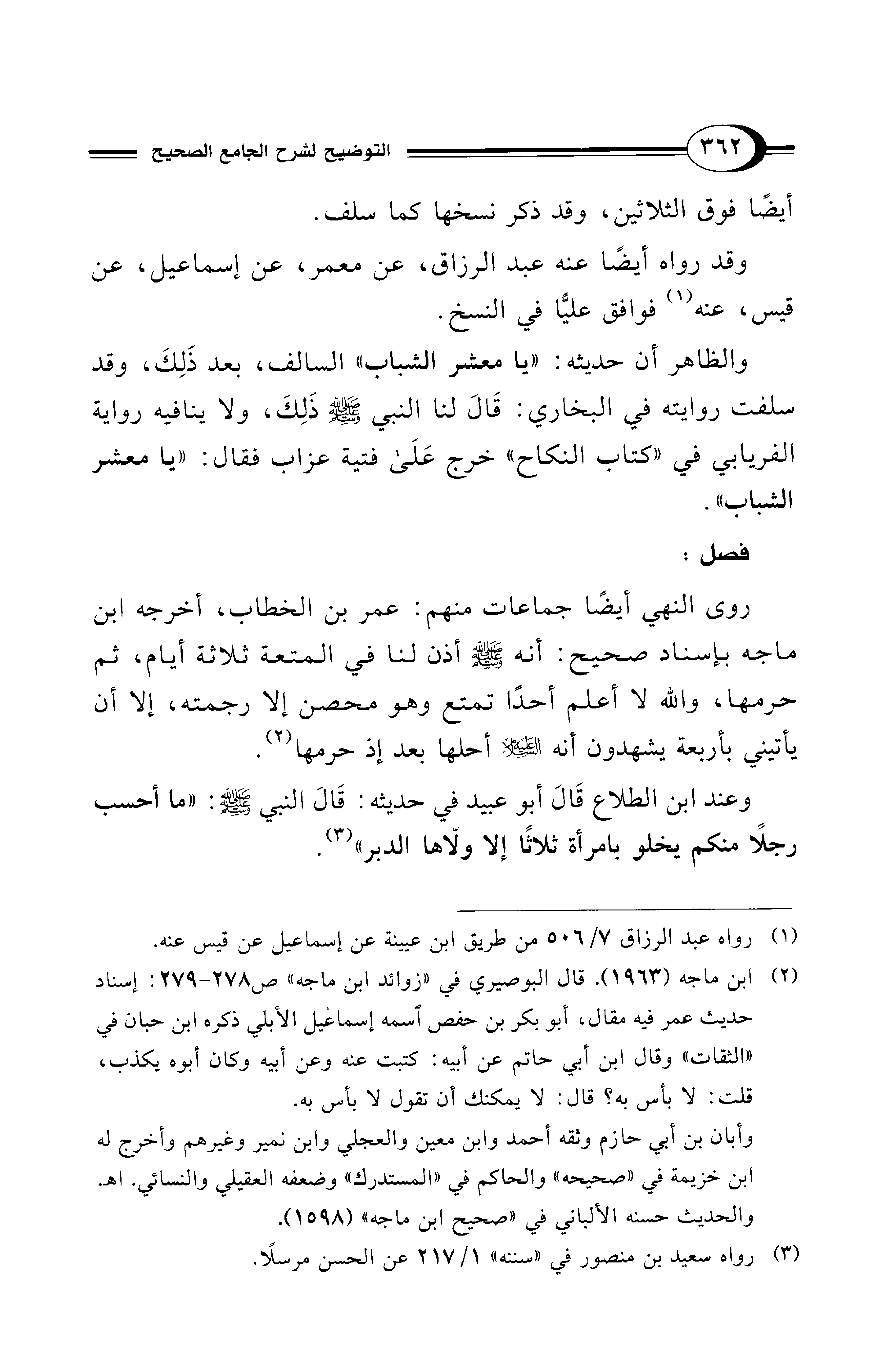 روى النهي أيضًا جماعات منهم: عمر بن الخطاب، أخرجه ابن ماجه بإسناد صحيح: أنه - صلى الله عليه وسلم - أذن لنا في المتعة ثلاثة أيام، ثم حرمها، والله لا أعلم أحدًا تمتع وهو محصن إلا رجمته، إلا أن يأتيني بأربعة يشهدون أنه - عليه السلام - أحلها بعد إذ حرمها (¬2).