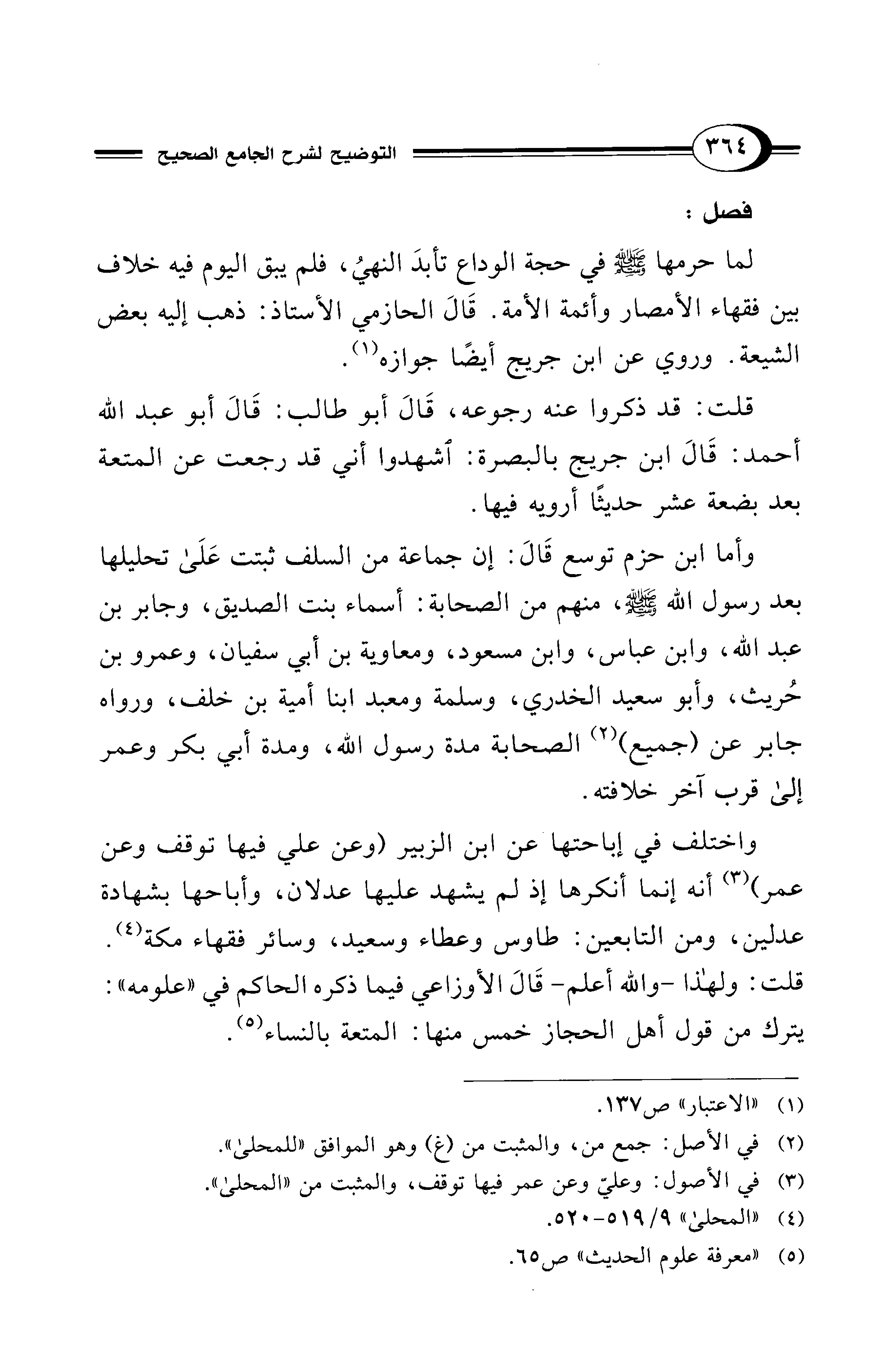 واختلف في إباحتها عن ابن الزبير (وعن علي فيها توقف وعن عمر) (¬3) أنه إنما أنكرها إذ لم يشهد عليها عدلان، وأباحها بشهادة عدلين، ومن التابعين: طاوس وعطاء وسعيد، وسائر فقهاء مكة (¬4). قلت: ولهذا -والله أعلم- قَالَ الأوزاعي فيما ذكره الحاكم في "علومه": يترك من قول أهل الحجاز خمس منها: المتعة بالنساء (¬5).