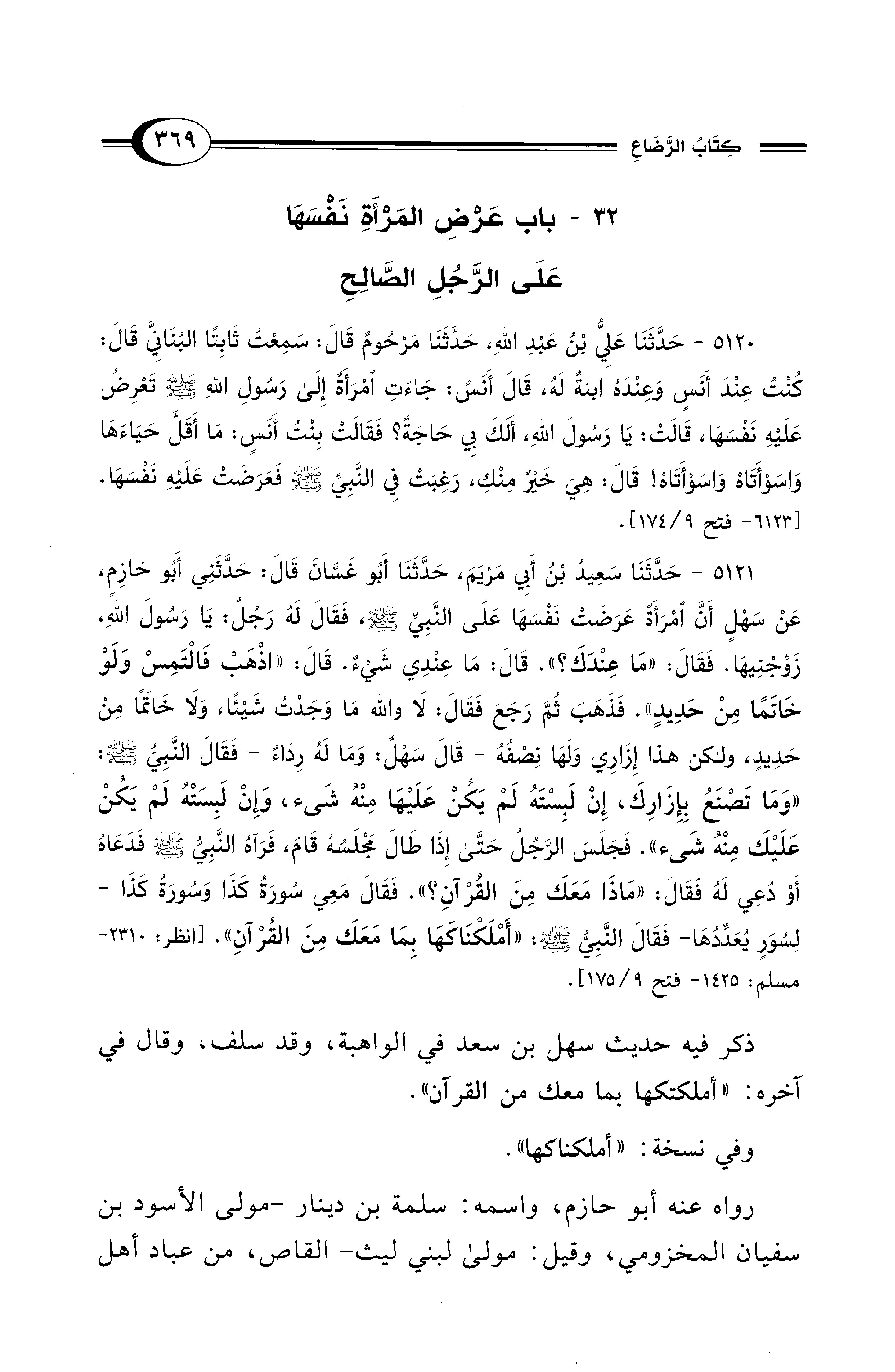 5121 - حَدَّثَنَا سَعِيدُ بْنُ أَبِي مَرْيَمَ, حَدَّثَنَا أَبُو غَسَّانَ قَالَ: حَدَّثَنِي أَبُو حَازِمٍ, عَنْ سَهْلٍ أَنَّ امْرَأَةً عَرَضَتْ نَفْسَهَا عَلَى النَّبِيِّ - صلى الله عليه وسلم -, فَقَالَ لَهُ رَجُلٌ: يَا رَسُولَ اللهِ, زَوِّجْنِيهَا. فَقَالَ: «مَا عِنْدَكَ؟». قَالَ: مَا عِنْدِي شَيْءٌ. قَالَ: «اذْهَبْ فَالْتَمِسْ وَلَوْ خَاتَمًا مِنْ حَدِيدٍ». فَذَهَبَ ثُمَّ رَجَعَ فَقَالَ: لاَ وَاللهِ مَا وَجَدْتُ شَيْئًا، وَلاَ خَاتَمًا مِنْ حَدِيدٍ، وَلَكِنْ هَذَا إِزَارِى وَلَهَا نِصْفُهُ -قَالَ سَهْلٌ: وَمَا لَهُ رِدَاءٌ -فَقَالَ النَّبِيُّ - صلى الله عليه وسلم -: «وَمَا تَصْنَعُ بِإِزَارِكَ, إِنْ لَبِسْتَهُ لَمْ يَكُنْ عَلَيْهَا مِنْهُ شَيْءٌ، وَإِنْ لَبِسَتْهُ لَمْ يَكُنْ عَلَيْكَ مِنْهُ شَيْءٌ». فَجَلَسَ الرَّجُلُ حَتَّى إِذَا طَالَ مَجْلَسُهُ قَامَ, فَرَآهُ النَّبِيُّ - صلى الله عليه وسلم - فَدَعَاهُ أَوْ دُعِي لَهُ فَقَالَ: «مَاذَا مَعَكَ مِنَ الْقُرْآنِ؟». فَقَالَ مَعِي سُورَةُ كَذَا وَسُورَةُ كَذَا -لِسُوَرٍ يُعَدِّدُهَا- فَقَالَ النَّبِيُّ - صلى الله عليه وسلم -: «أَمْلَكْنَاكَهَا بِمَا مَعَكَ مِنَ الْقُرْآنِ". [انظر: 2310 - مسلم: 1425 - فتح 9/ 175].
