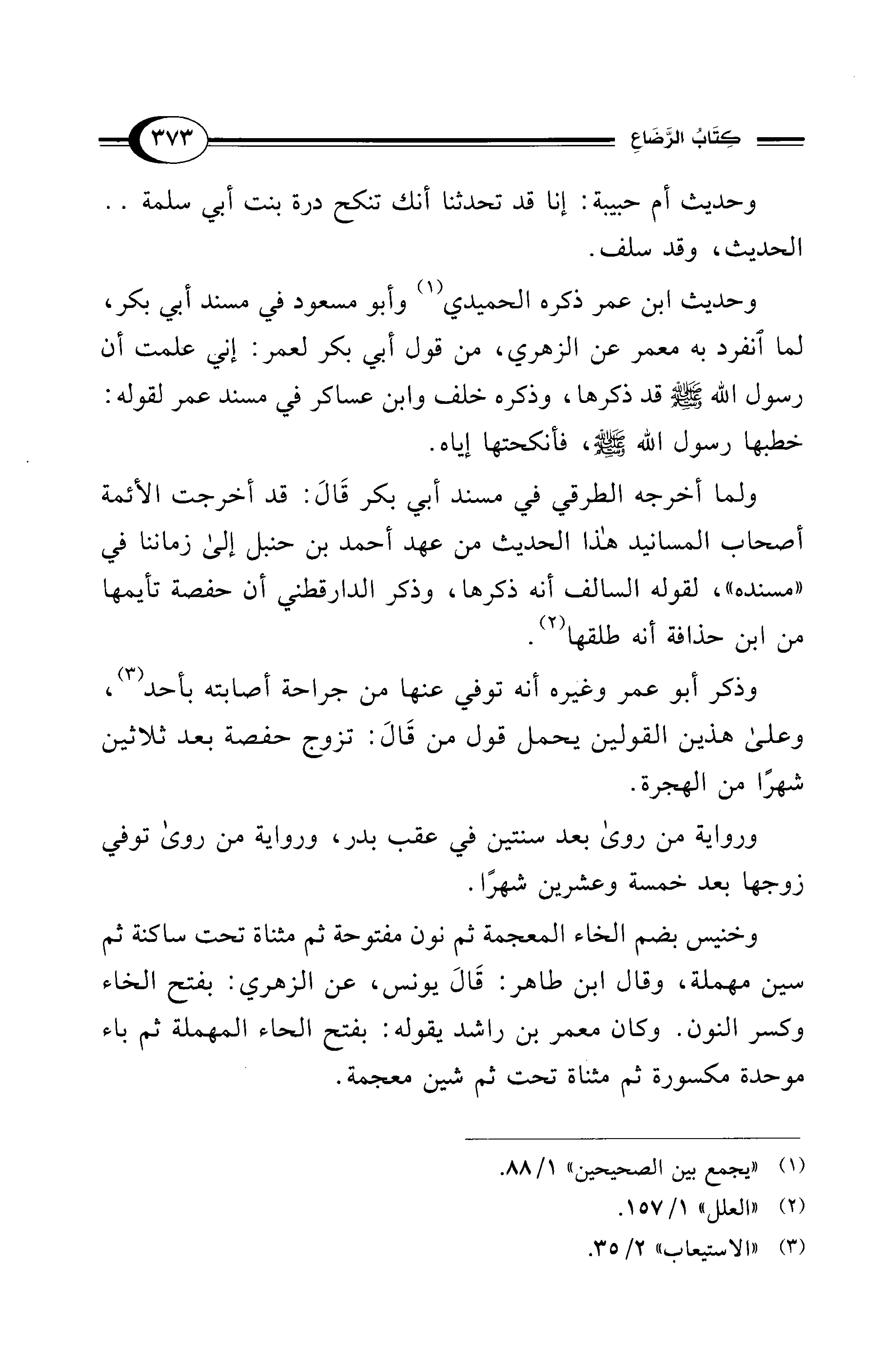 وذكر أبو عمر وغيره أنه توفي عنها من جراحة أصابته بأحد (¬3)، وعلى هذين القولين يحمل قول من قَالَ: تزوج حفصة بعد ثلاثين شهرًا من الهجرة.