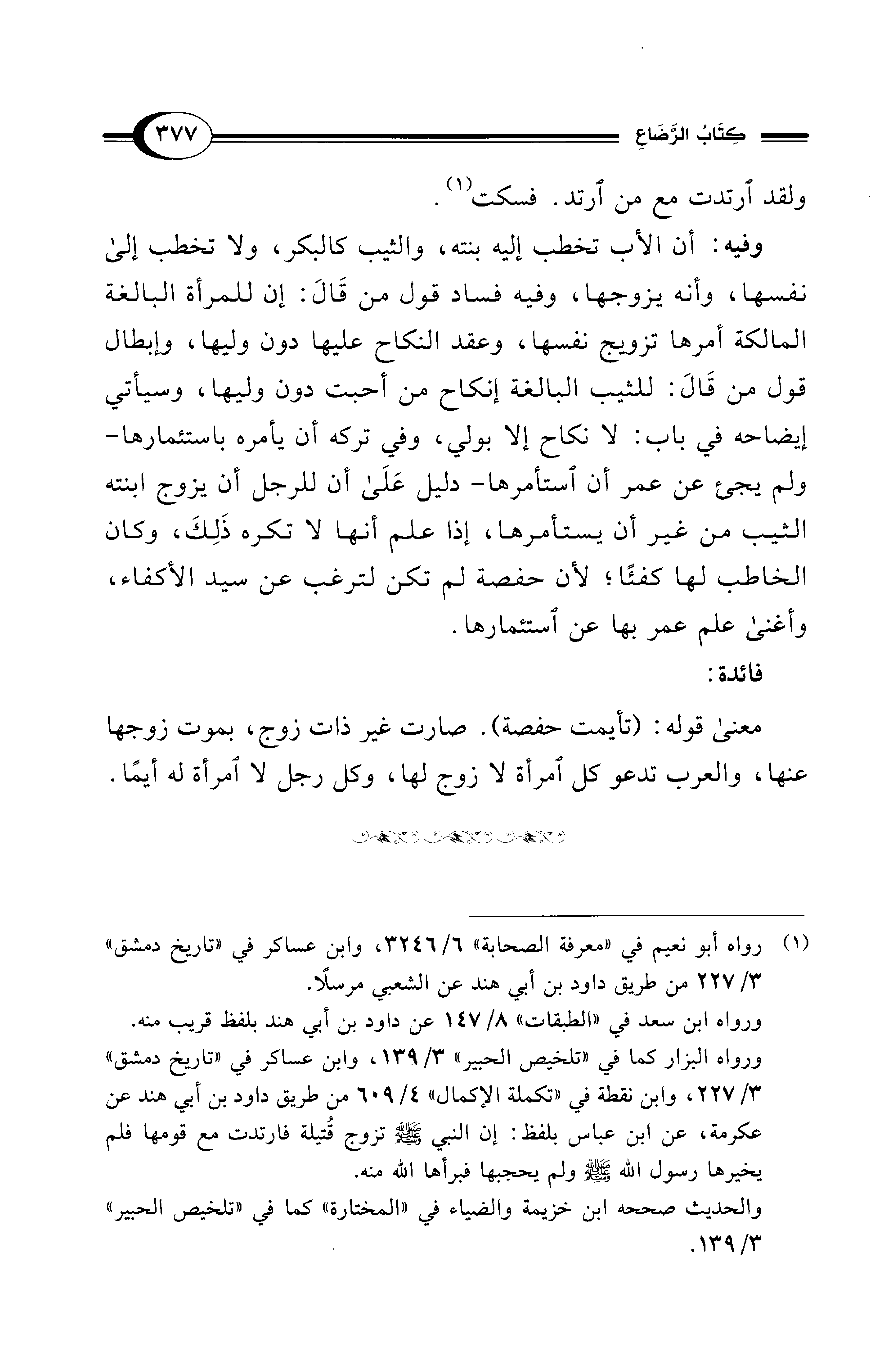 وفيه: أن الأب تخطب إليه بنته، والثيب كالبكر، ولا تخطب إلى نفسها، وأنه يزوجها، وفيه فساد قول من قَالَ: إن للمرأة البالغة المالكة أمرها تزويج نفسها، وعقد النكاح عليها دون وليها، وإبطال قول من قَالَ: للثيب البالغة إنكاح من أحبت دون وليها، وسيأتي إيضاحه في باب: لا نكاح إلا بولي، وفي تركه أن يأمره باستئمارها -ولم يجئ عن عمر أن استأمرها- دليل عَلَى أن للرجل أن يزوج ابنته الثيب من غير أن يستأمرها، إذا علم أنها لا تكره ذَلِكَ، وكان الخاطب لها كفئًا؛ لأن حفصة لم تكن لترغب عن سيد الأكفاء، وأغنى علم عمر بها عن استئمارها.