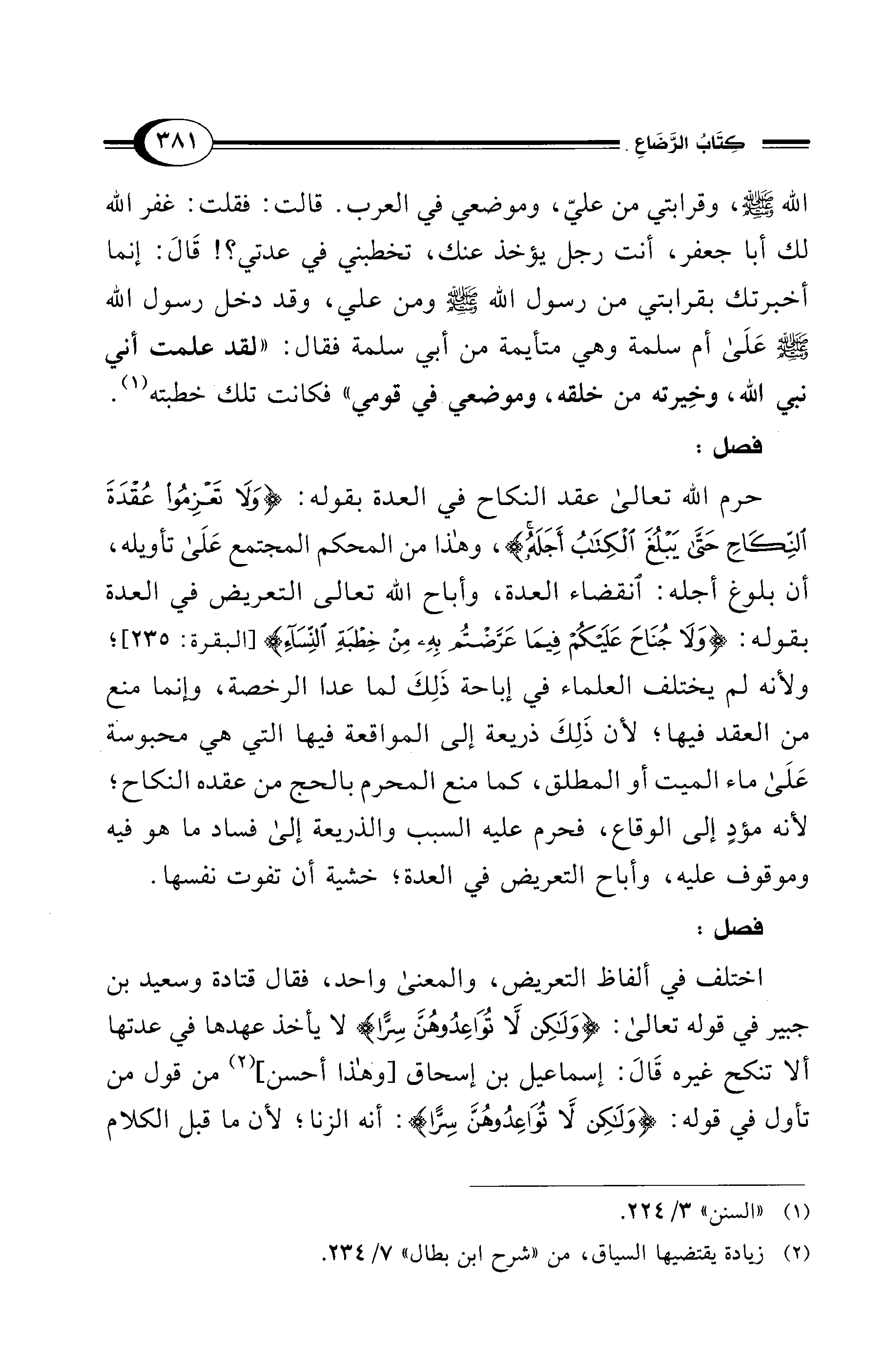اختلف في ألفاظ التعريض، والمعنى واحد، فقال قتادة وسعيد بن جبير في قوله تعالى: {وَلَكِنْ لَا تُوَاعِدُوهُنَّ سِرًّا} لا يأخذ عهدها في عدتها ألا تنكح غيره قَالَ: إسماعيل بن إسحاق [هذا أحسن] (¬2) من قول من تأول في قوله: {وَلَكِنْ لَا تُوَاعِدُوهُنَّ سِرًّا}: أنه الزنا؛ لأن ما قبل الكلام